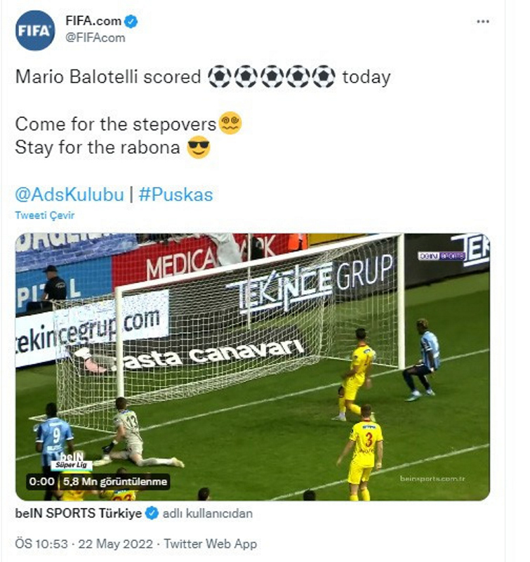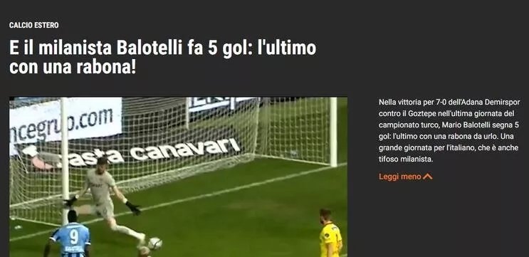 Süper Lig'in son gününde Adana Demirspor, Göztepe'yi 7-0 mağlup etti. Mario Balotelli maçta 5 gol attı ama sonuncu gol rabona ile geldi. Çığlıklar atan bir gol. Aynı zamanda Milan taraftarı olan Balotelli için harika bir gün.
