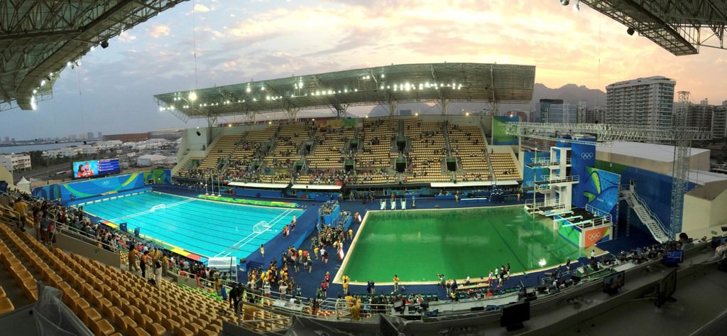 Atlama, sutopu ve senkronize yüzme yarışmalarının yapıldığı Maria Lenk Su Sporları Merkezi'ndeki havuzlardan birinin renginin, kadınlar senkronize 10 metre platform atlama finali sırasında yeşile dönüşmesi şaşkınlığa sebep oldu.