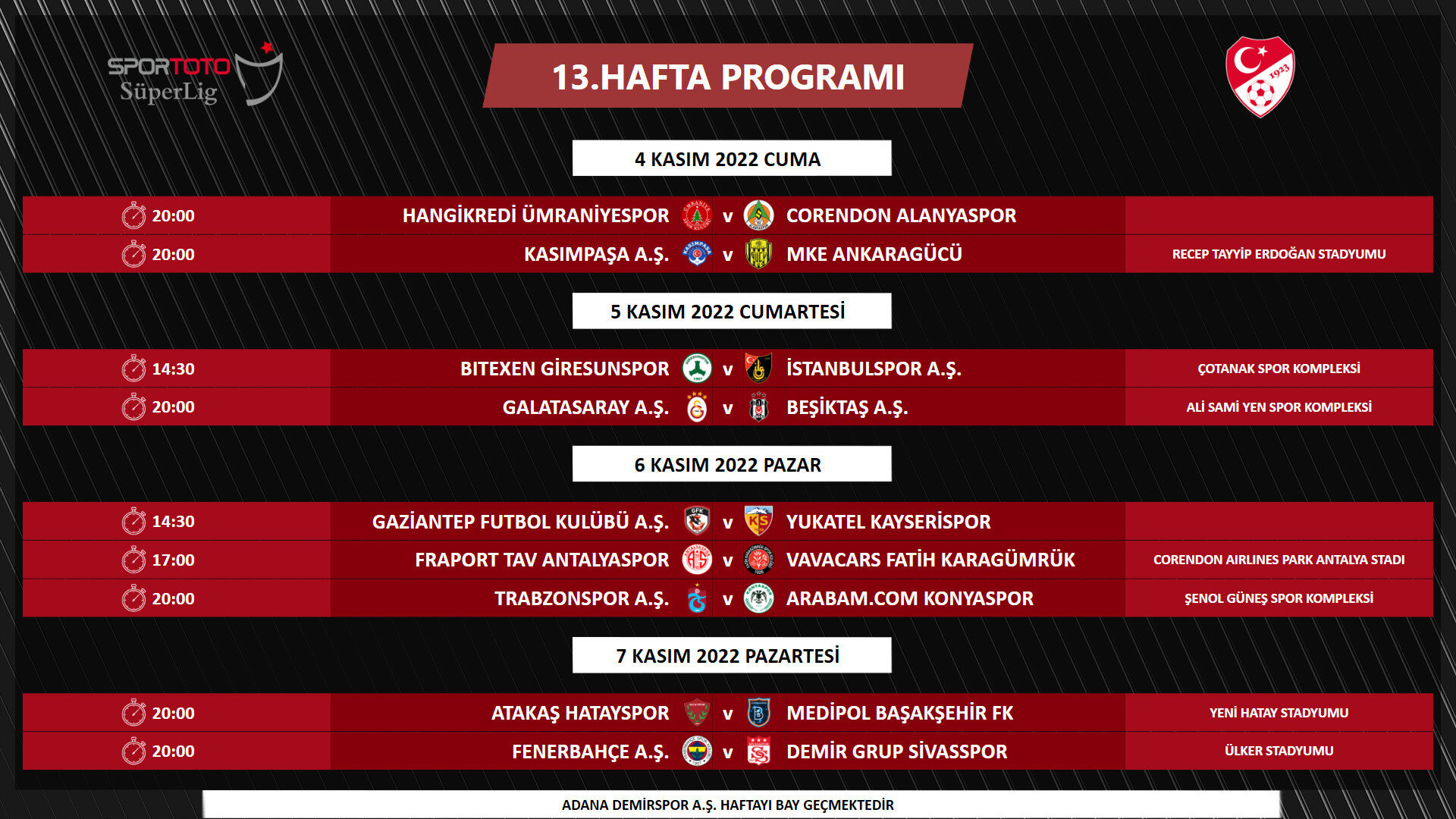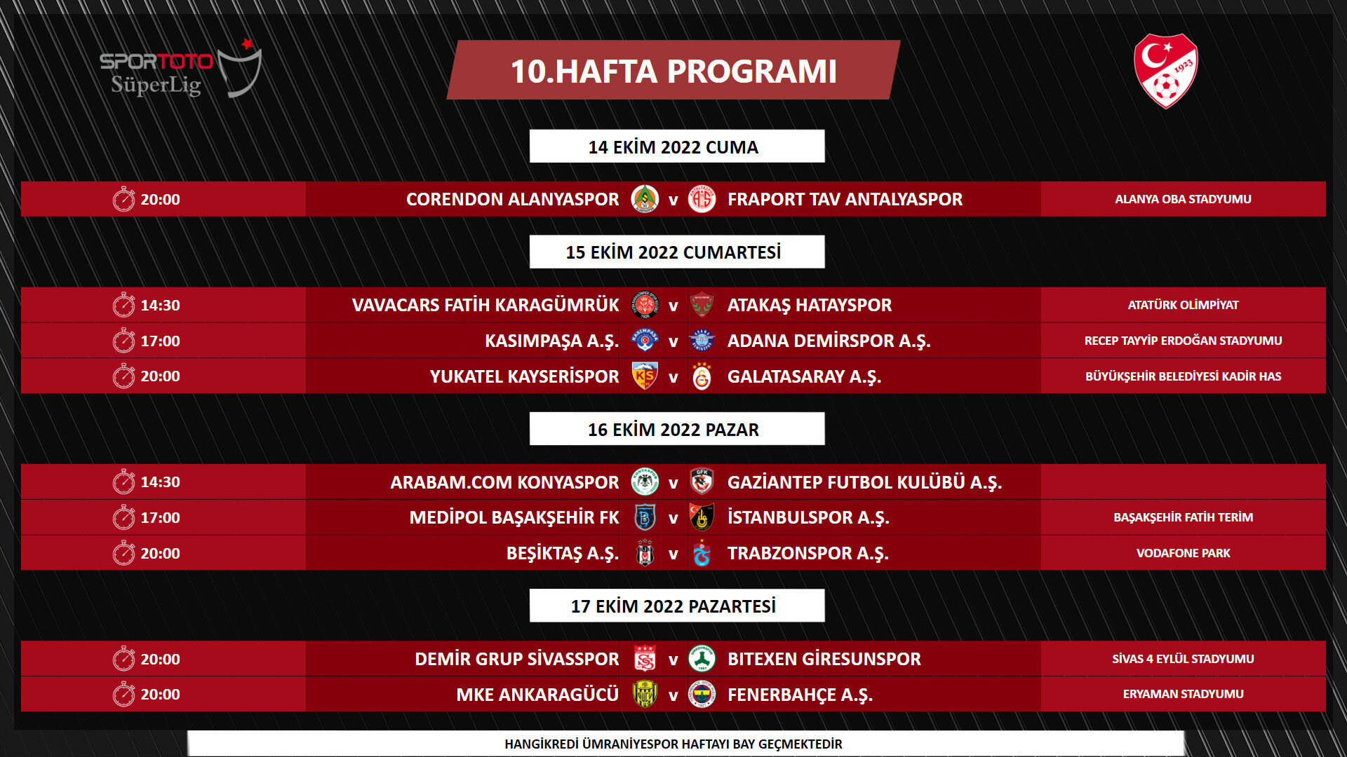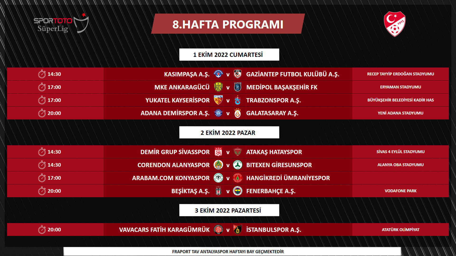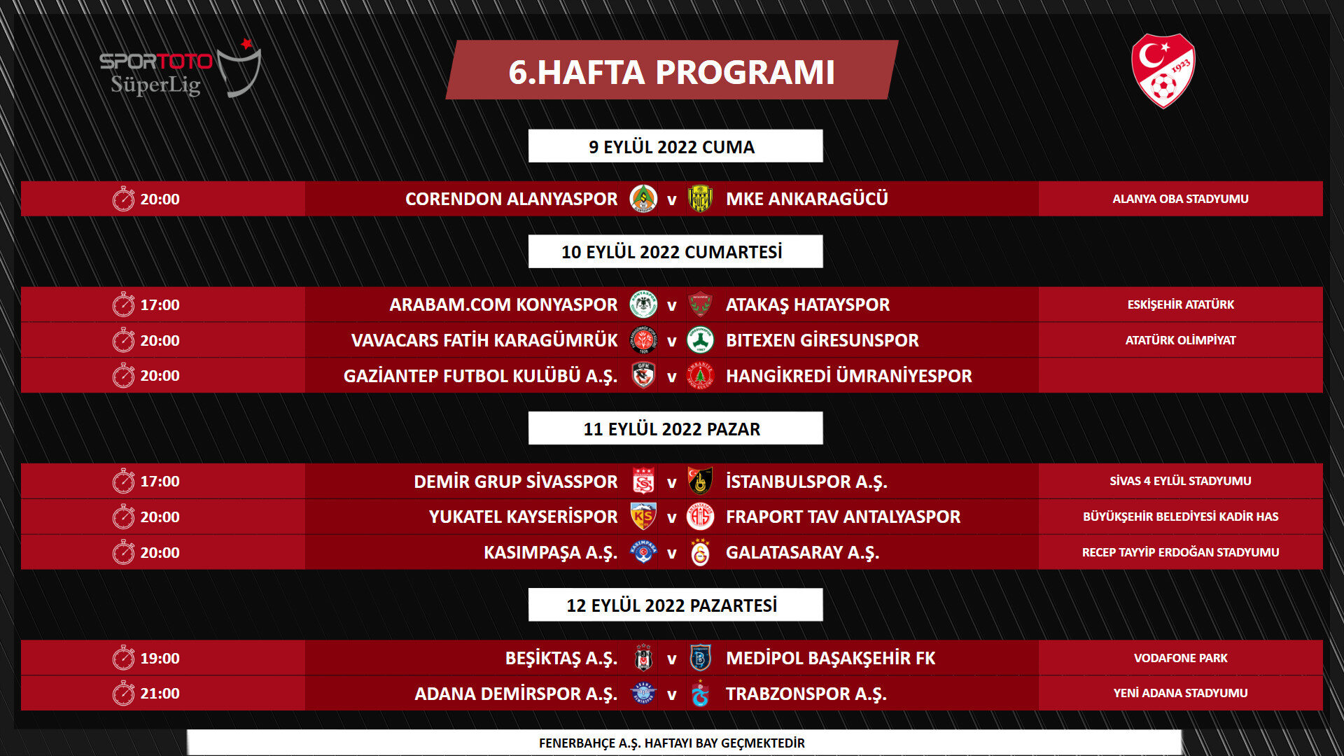 2022-2023 Sezonu Spor Toto Süper Lig 6-14. hafta müsabaka programı açıklandı. TFF'den yapılan açıklamada, "Yayıncı kuruluş ve Kulüpler Birliği Vakfı ile yapılan değerlendirmeler sonucunda, 6. ve 7. haftalarda müsabaka başlangıç saatleri 17.00 ve 20.00, ligin 8. haftasından itibaren ise 14.30, 17.00 ve 20.00 olarak planlanmıştır.