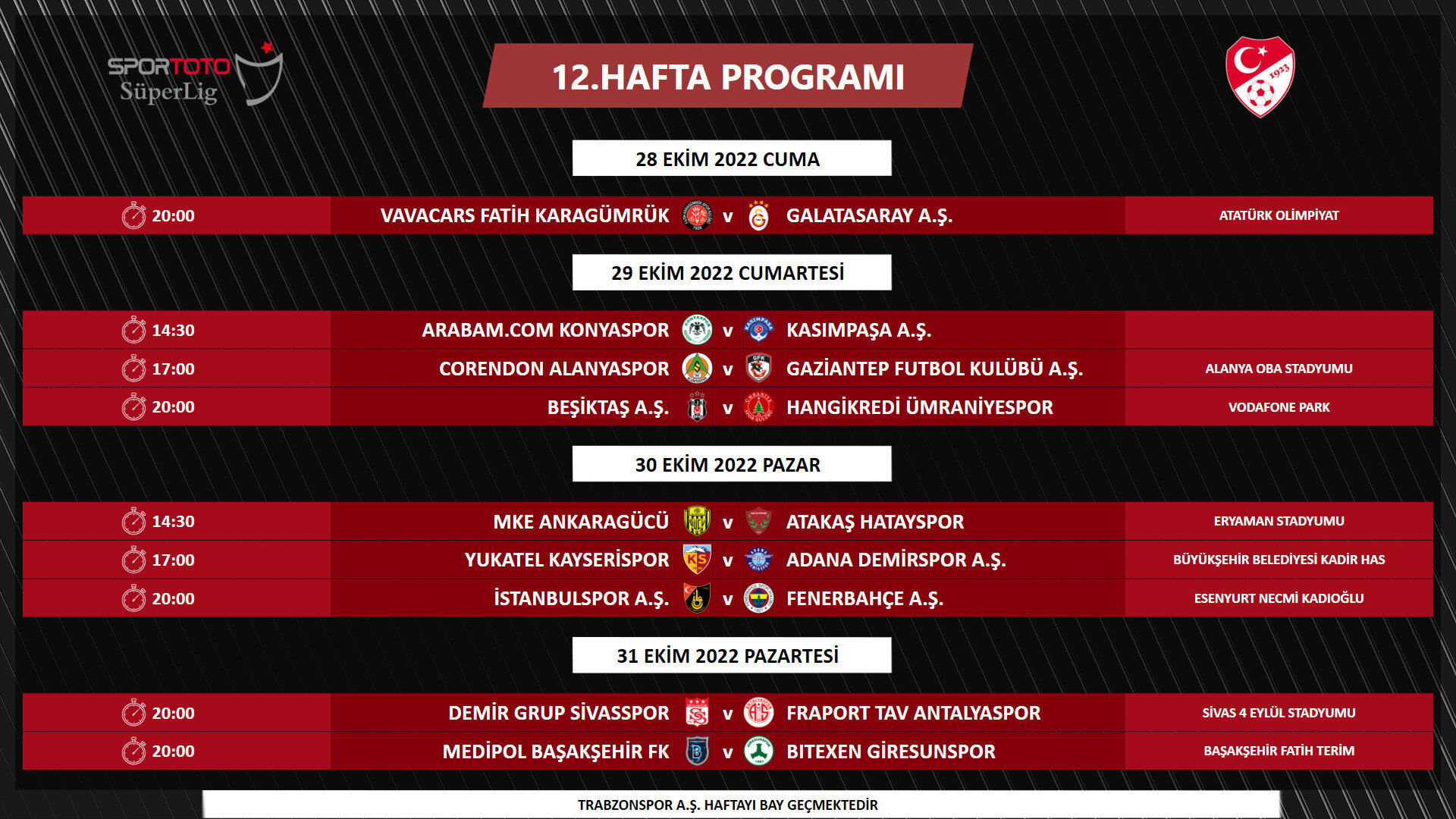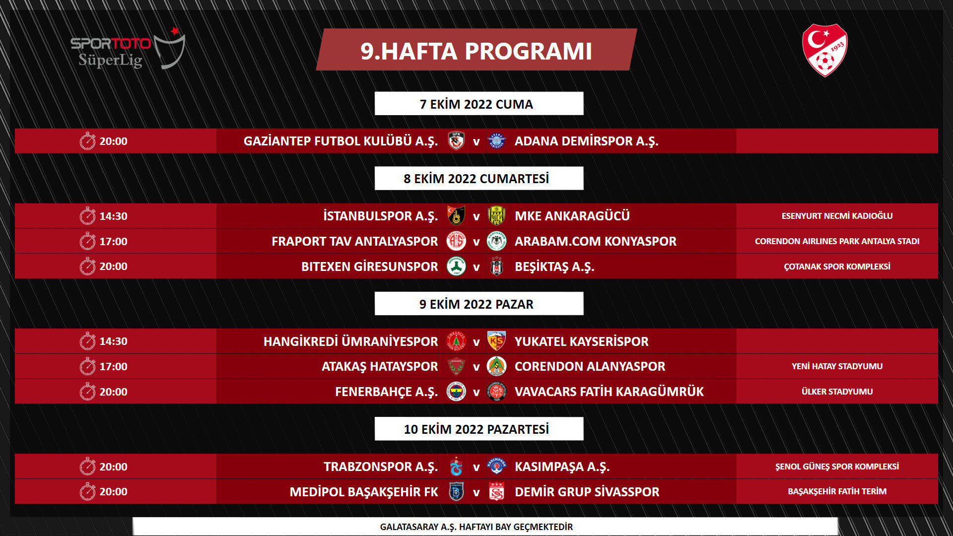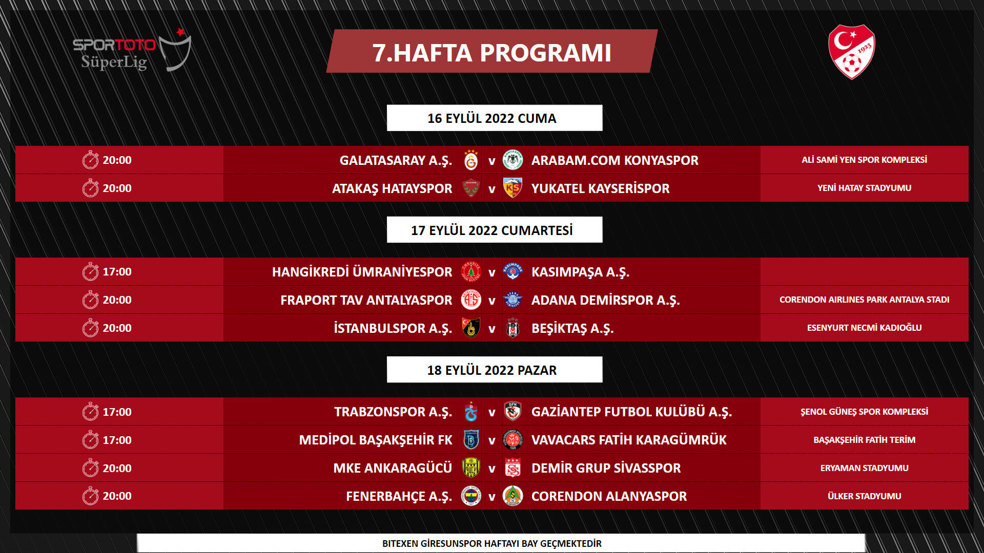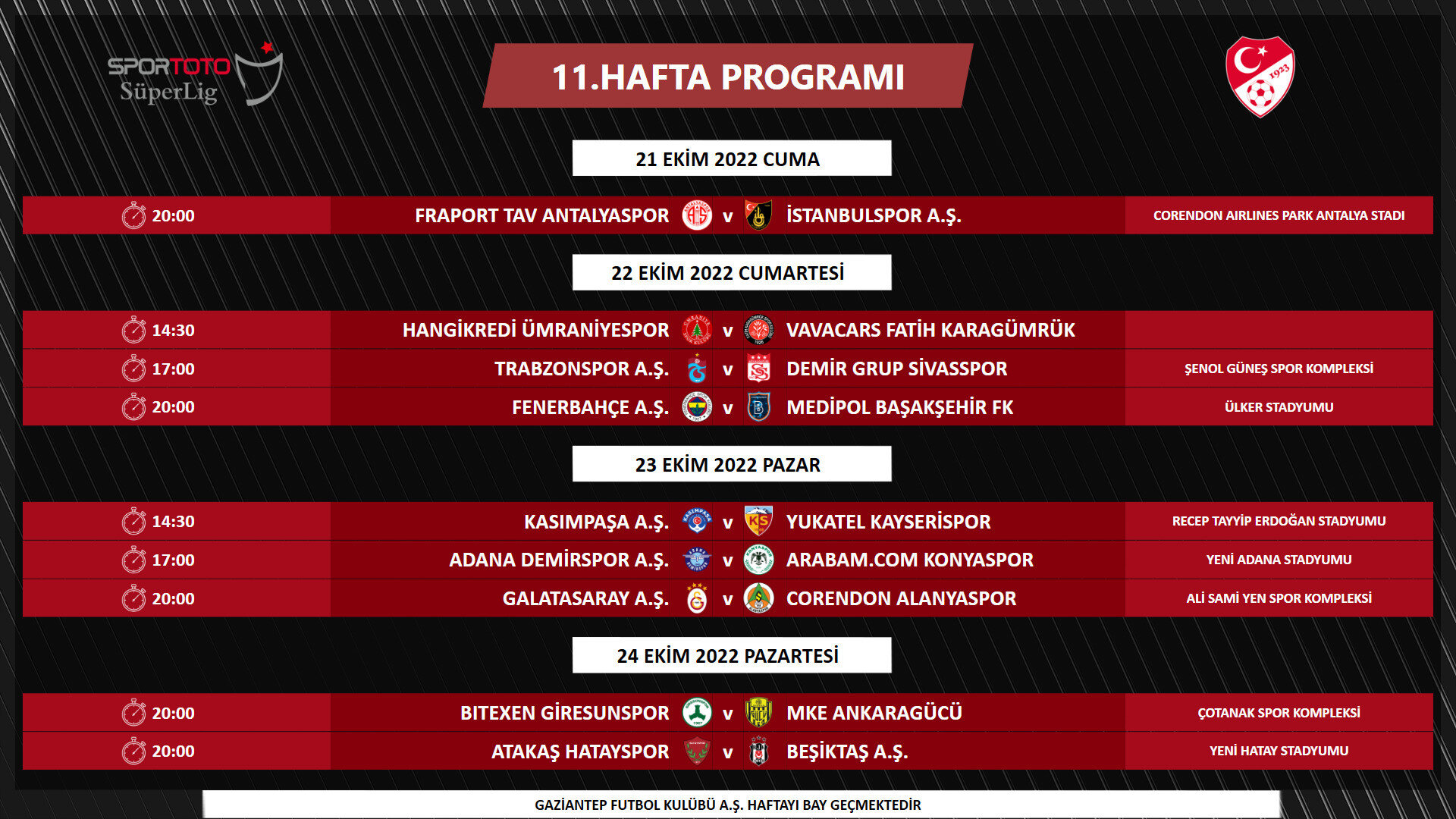 Program, UEFA Kupalarında mücadele eden takımlarımızın müsabakaları, yayıncı kuruluşun yayın prensipleri ve Ziraat Türkiye Kupası müsabakaları dikkate alınarak hazırlanmıştır. FIFA talimatları gereğince milli maç haftaları öncesinde Pazartesi günlerine müsabaka planlanamamaktadır. Bununla birlikte müsabaka programında mücbir sebepler, yayın programında yaşanabilecek değişiklikler ve Ziraat Türkiye Kupası'nda oluşacak eşleşmelere göre değişiklik yapılabilir." ifadelerine yer verildi.