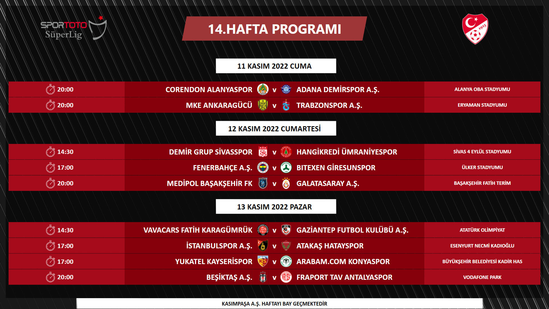 2022-2023 Sezonu Spor Toto Süper Lig 6-14. hafta müsabaka programı açıklandı. TFF'den yapılan açıklamada, "Yayıncı kuruluş ve Kulüpler Birliği Vakfı ile yapılan değerlendirmeler sonucunda, 6. ve 7. haftalarda müsabaka başlangıç saatleri 17.00 ve 20.00, ligin 8. haftasından itibaren ise 14.30, 17.00 ve 20.00 olarak planlanmıştır. Dünya Kupası arasından sonra 15. haftadan itibaren oynanacak olan müsabakaların başlama saatleri tekrar değerlendirilecektir.