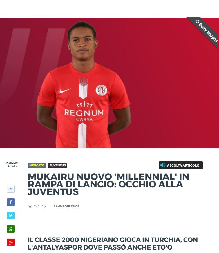 Calciomercato'da yer alan habere göre, Antalyaspor forması giyen 2000 doğumlu Nijeryalı futbolcu Paul Mukairu siyah-beyazlı ekibe önerildi.
