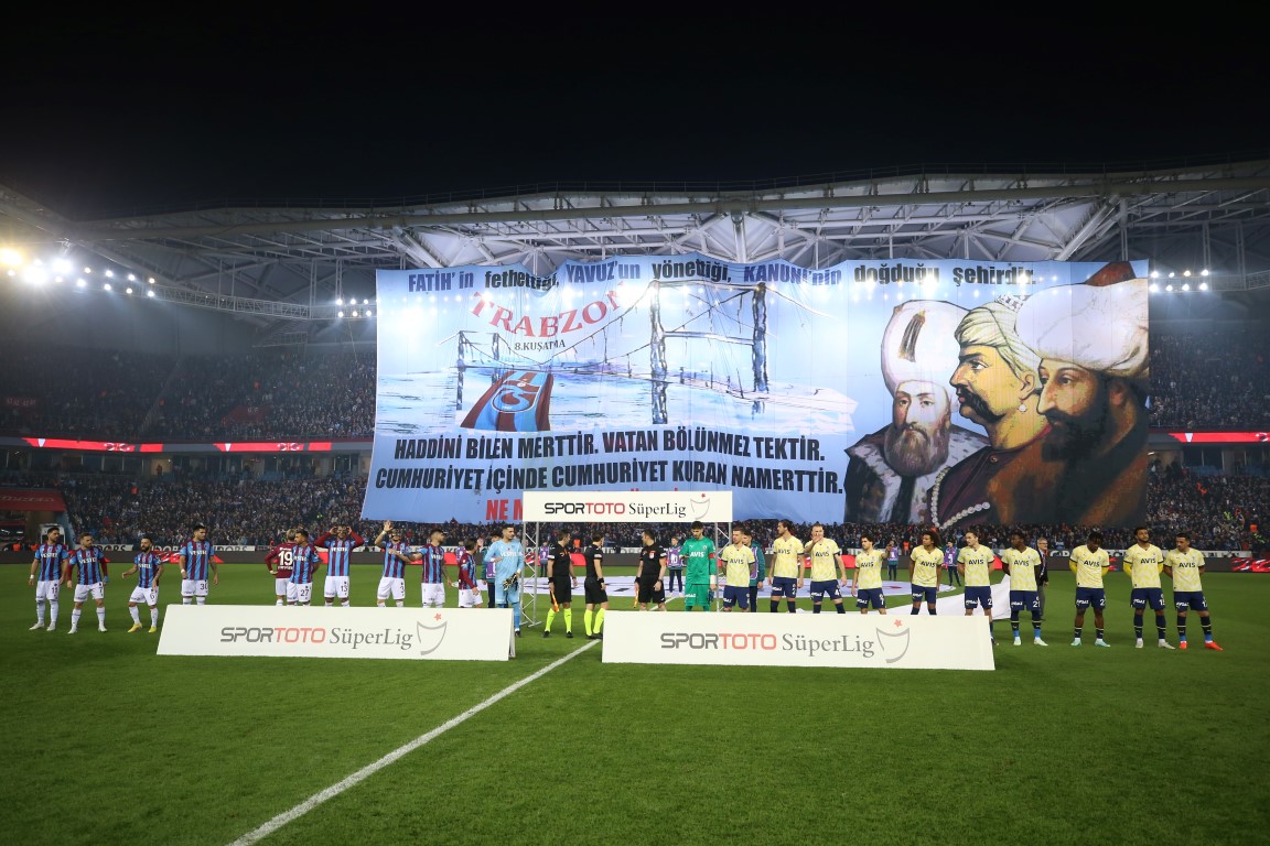 Spor Toto Süper Lig'de sahasında Fenerbahçe'yi konuk eden Trabzonspor'da, teknik direktör Abdullah Avcı, Ziraat Türkiye Kupası'ndaki Yılport Samsunspor maçı 11'ine göre 5 oyuncu değişikliği yaptı. Diğer yandan Trabzonsporlu taraftarlar, maç öncesi tribünde koreografi gerçekleştirdi. Taraftarlar tarafından hazırlanan koreografi de, "Fatih'in fethettiği, Yavuz'un yönettiği, Kanuni'nin doğduğu şehirdir Trabzon. Haddini bilen merttir. Vatan bölünmez tektir. Cumhuriyet içinde Cumhuriyet kuran namerttir. Ne mutlu Türküm diyene." ifadelerine yer verildi.