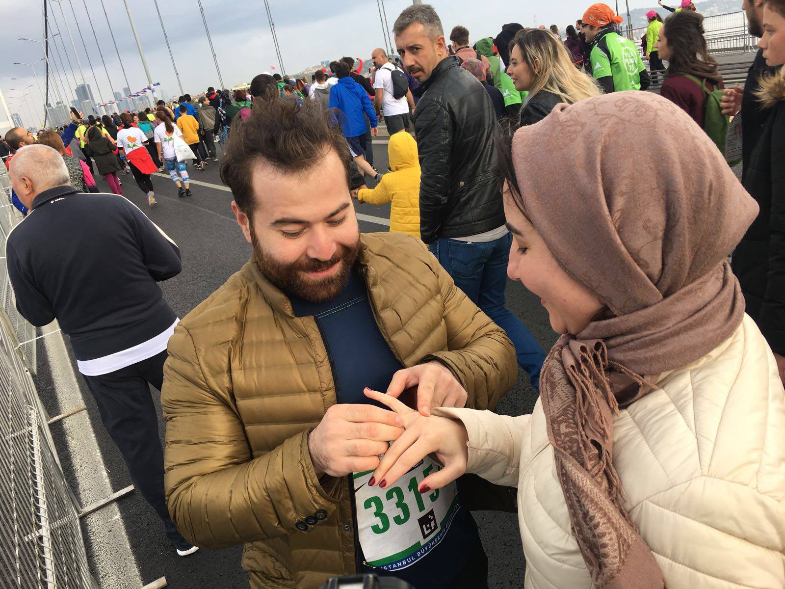 15 Temmuz Şehitler Köprüsü'nde ilginç anlar da yaşandı. 39 .Avrasya Maratonu'na katılan Azerbaycanlı Magsud Mammadov, 15 Temmuz Şehitler Köprüsü'nde sevgilisine evlenme teklif etti.