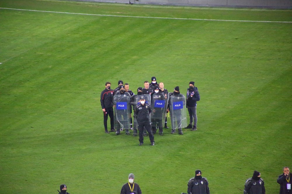 Hüseyin Göçek'e tepki gösteren Adil Gevrek'i güvenlik güçleri önledi. Saha içerisinde polis ekipleri tarafından korunan hakem Hüseyin Göçek, yaklaşık 20 dakika sahadan çıkamadı.