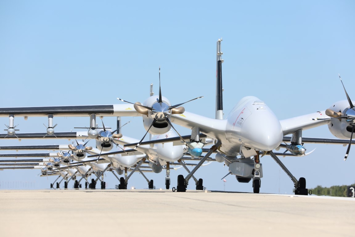 AKINCI Uçuş Eğitim ve Test Merkezi'nde bulunan Bayraktar AKINCI TİHA'lar filo olarak toplu fotoğraf ve video çekimi için bir araya getirildi.