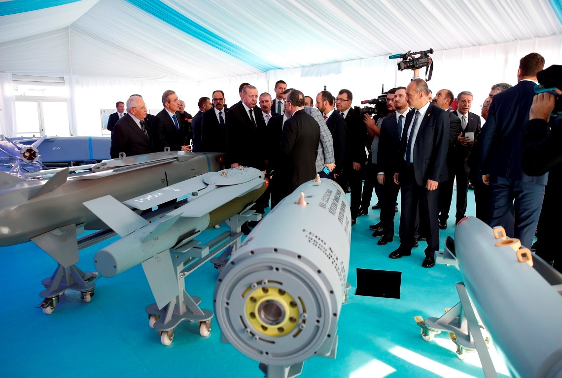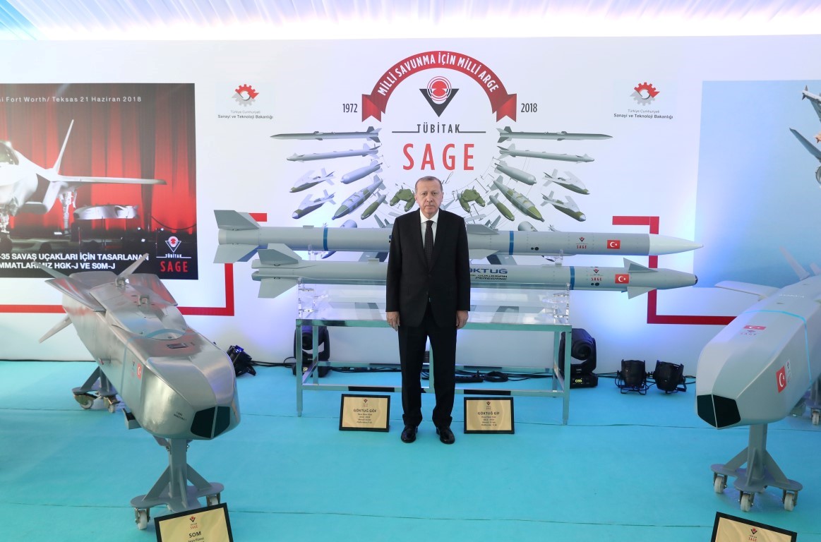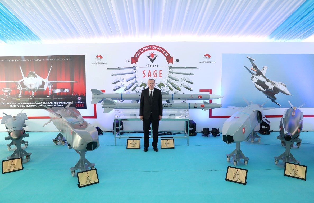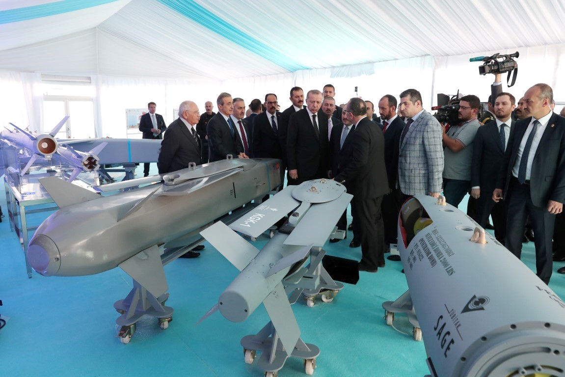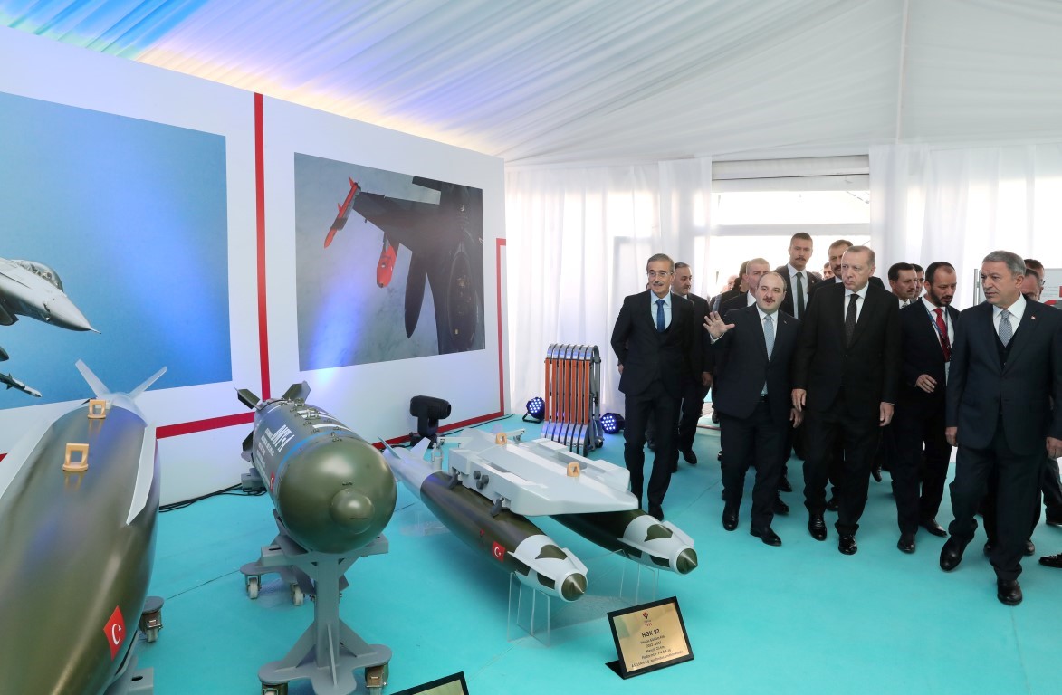 Cumhurbaşkanı Erdoğan, açılış töreni öncesi TÜBİTAK SAGE tarafından F-35 savaş uçakları için tasarlanan yerli ve milli mühimmatların sergilendiği alanı gezdi.
