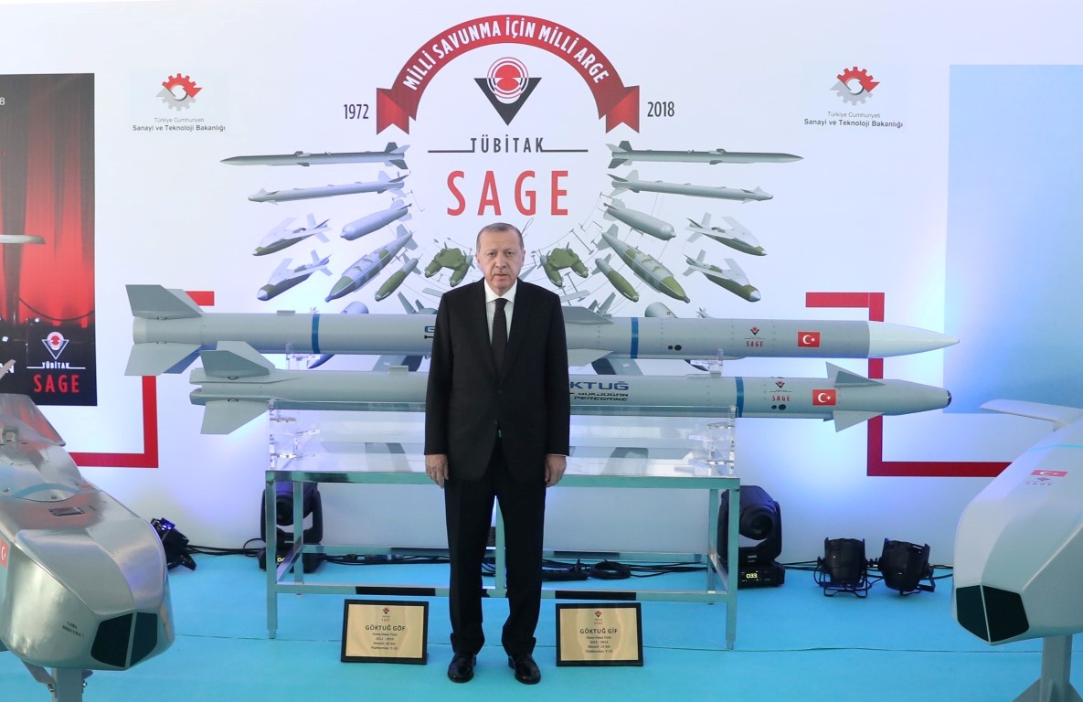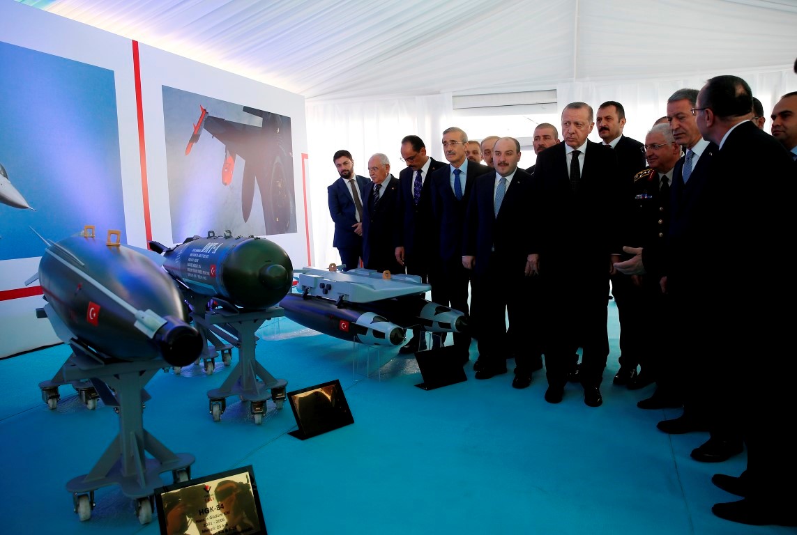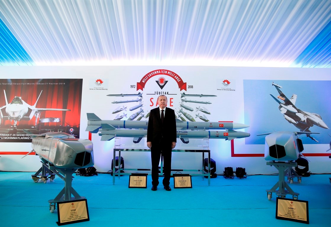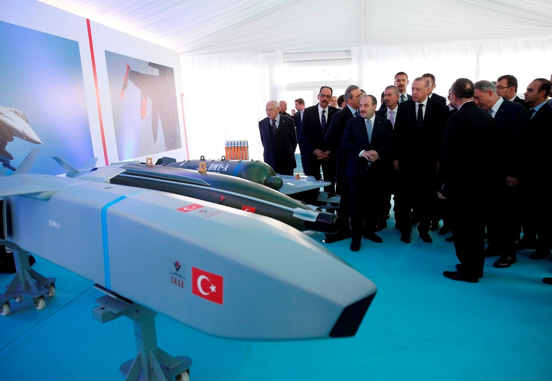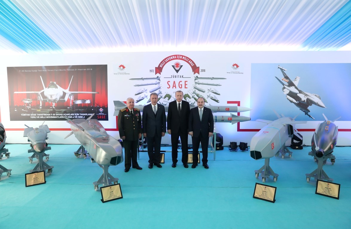 Cumhurbaşkanı Erdoğan, açılış töreni öncesi TÜBİTAK SAGE tarafından F-35 savaş uçakları için tasarlanan yerli ve milli mühimmatların sergilendiği alanı gezdi.