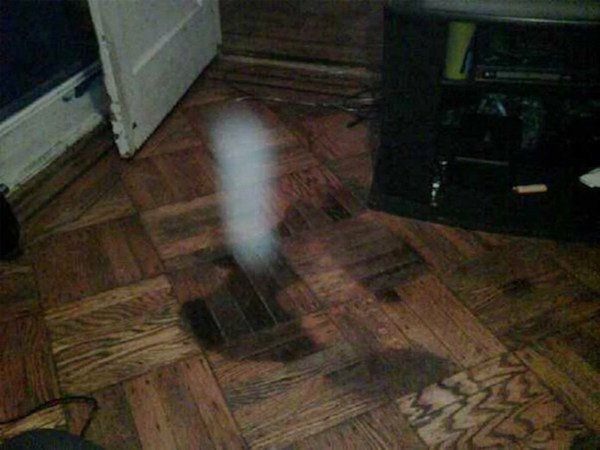 "Queens, New York'taki büyüdüğüm evde halıyı kaldırmıştım. Odayı düzenledikten sonra parkenin üzerinde insan şeklini andıran siyah bir leke fark ettim. Neredeyse bir vücudu o kadar uzun süre bırakmışsın ki yerde leke olmuş gibiydi. Ben de bu fotoğrafı çekmeye karar verdim. Kalitesi yüzünden özür dilerim, 2008 yılında Blackberry ile çekilmişti. Fotoğraftaki açıklanamayan kısım leke değil, gördüğünüz beyaz madde."
