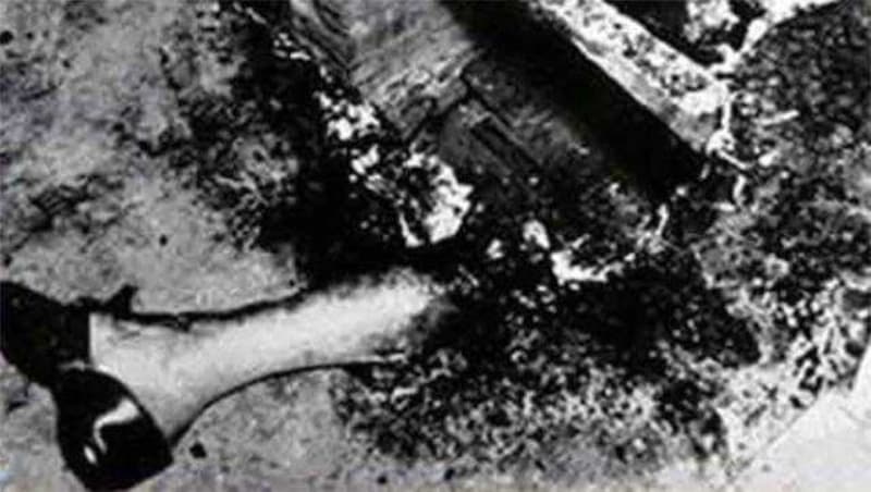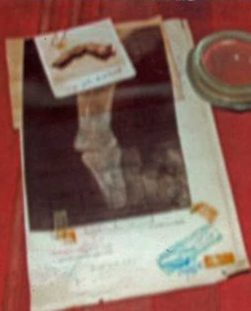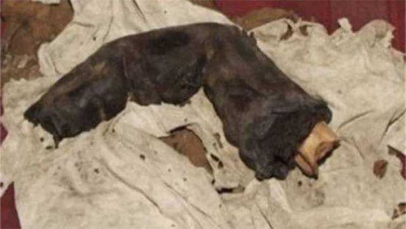 Fotoğrafta bir "dev"in ürkütücü parmağı görülüyor. Parmak kemiği muhtemelen bir baltayla kesilmiş ve mumyalanmış. Bazı yerleri çökmüş. Kopuk kopuk kösele gibi bir deri. Bölünmüş gevşek bir tırnak. Evet, bu korkunç bir varlığa ait bir parmak ve uzunluğu 38 cm.