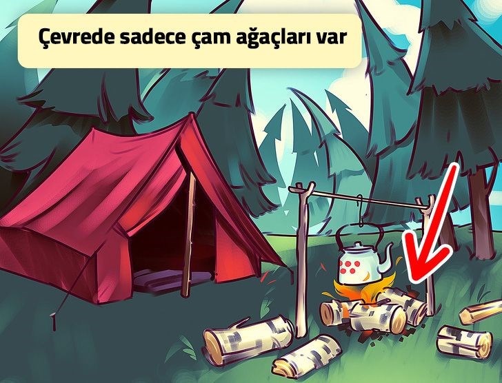 Çevrede sadece çam ağaçları varken kamp ateşinin başka odunlarla yakılmış olması