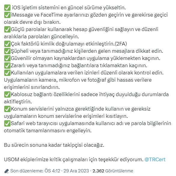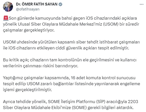 Uluslararası kamuoyu ile birlikte gerekli önlemlerin acil olarak alınması için hazır olduklarını vurgulayan Sayan, "Küresel siber zafiyetlere karşı ciddi yaptırımların uygulanması gerektiğini bir kez daha vurguluyoruz. Dijital izleme ve siber casuslukla mücadele, milli güvenliğimizin ayrılmaz bir parçasıdır. USOM'un yaptığı siber tehdit istihbarat çalışmalarının sonuçlarına dayanarak, iOS cihaz kullanan vatandaşlarımızın aşağıdaki güvenlik önlemlerine dikkat etmelerini öneriyoruz" dedi.