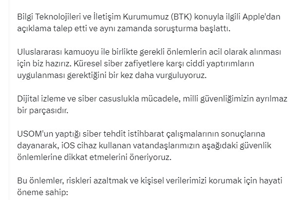 Ayrıca tehdide yönelik SOME İletişim Platformu (SİP) aracılığıyla 2203 Siber Olaylara Müdahale Ekibimize (SOME) gerekli bilgileri aktardık. Bilgi Teknolojileri ve İletişim Kurumumuz (BTK) konuyla ilgili Apple'dan açıklama talep etti ve aynı zamanda soruşturma başlattı" ifadelerini kullandı.