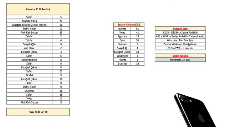 Batarya süresi olarak 7 Plus başarılı bir telefon. Özellikle A10 Fusion işlemcisinin enerji verimliliği çok iyi kalibre edilmiş. Pil ömrünü ölçmek adına yaptığımız testlerde iki farklı kullanım senaryosu denedik. İlk kullanımımızda ekran parlaklığını full yaparak kullandık. %100'den pil bitene kadar yaptığımız tüm işlemleri sol taraftaki tabloda tek tek görebilirsiniz. Sağ tarafta ise genelleme yaparak cihazı ne kadar kullandığımızı gösterdik. Bu senaryo ile iPhone 7 Plus'ı 11 saat boyunca kullanabildik. İkinci senaryoda ise ekran parlaklığını orta seviyede tutarak %100'den %50'ye kadar kullandık. %50'den sonra ise 0 seviyesine kadar pil tasarruf modunu açtık. Bu kullanım şekliyle telefon bir günden fazla açık kaldı. Bu testlerin sonucunda iPhone 7 Plus'ın bir gün boyunca yeterli olacağını rahatlıkla söyleyebilirim. Ancak yine de iPhone 7 Plus uzun şarj süresi ve hızlı şarj özelliğinin olmaması ile bizden eksi puan alıyor.