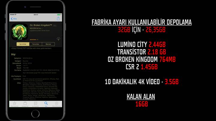 Yeni donanımın avantajlarını kullanan mevcut oyunlardan sadece Lumino City 2.44GB, Transistor 2.18GB, OZ Broken Kingdom 764MB ve CSR Racing 2, 1.45GB yer kaplıyor. 4 oyunun 7GB'a yakın yer kapladığını birde 4K Videoların sadece dakikasının 350MB olduğunu da hesaba katarsak, 32Gb'lık seçeneğinde zamanla 16GB etkisi yaratacağını tahmin edebiliriz. Bol fotoğraf çekip oyun oynayan kişilerin 128Gb seçeneğini tercih etmeleri mantıklı olacaktır.