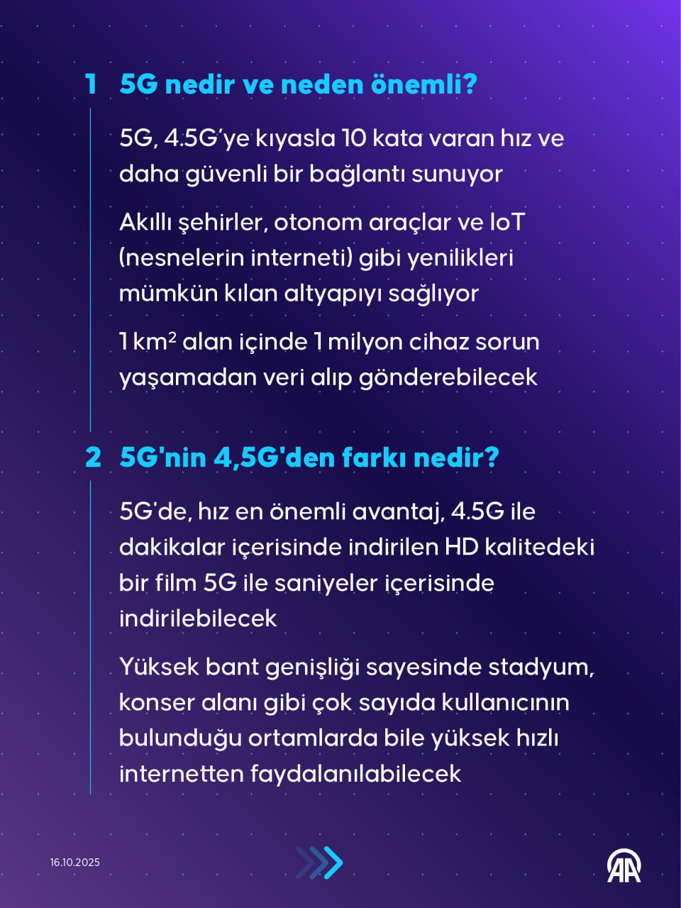 5G, yeni nesil mobil iletişim altyapısı olarak öne çıkıyor. 4.5G'ye kıyasla 10 kata varan hız ve daha güvenli bir bağlantı sunan 5G, internette yapılan tüm kullanımları daha yüksek hızla, daha düşük gecikme ile deneyimleme imkanı tanıyacak.