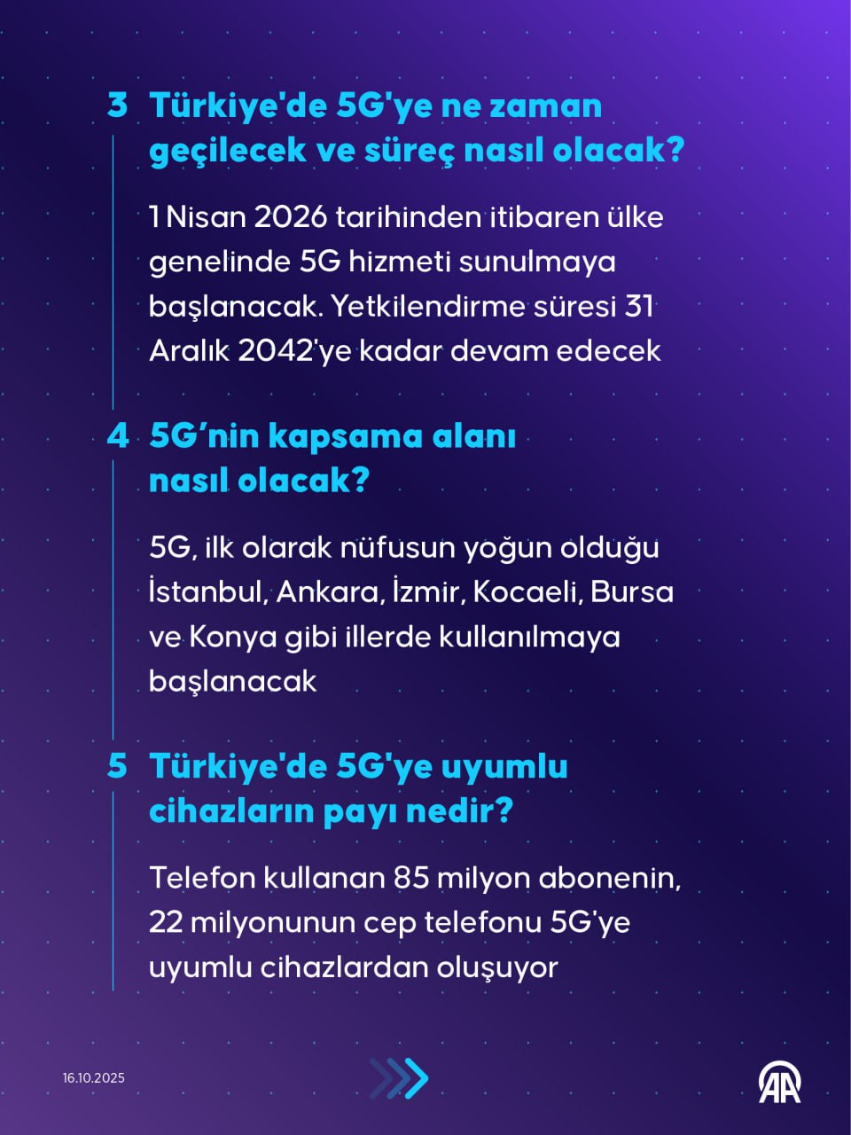 Mevcut mobil internet hızlarını en az 10 kat artırma potansiyeline sahip 5G teknolojisi, Türkiye genelinde 1 Nisan 2026'dan itibaren hizmete açılacak. Bugün düzenlenen 5G ihalesinde, iki farklı frekans bandında yer alan 11 paket için yapılan en yüksek tekliflerin toplamı KDV dahil 3 milyar 534 milyon dolar olarak kaydedildi. İşte 5G hakkında merak edilen 10 sorunun yanıtı...