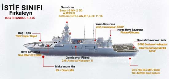 Milli fırkateyn İstanbul F-515 için kritik bir adım geldi. STM Savunma Teknolojileri Mühendislik ve Ticaret AŞ ana yükleniciliğinde, Ada sınıfı MİLGEM korvetlerinin devamında inşa edilen milli İstanbul Fırkateyni'nde yerlilik oranının yüzde 75'e çıkarılması hedefleniyor. Endüstriyel üretim yapan ve teknoloji odaklı yerli tedarikçilerin sözleşme genelindeki anlaşma hacimleri üçte iki seviyesinde bulunuyor. İstanbul Fırkateyni F-515 i, Ocak 2023'te seyir kabul testlerine başlayacak, Eylül 2023'te Deniz Kuvvetleri Komutanlığına teslim edilecek.