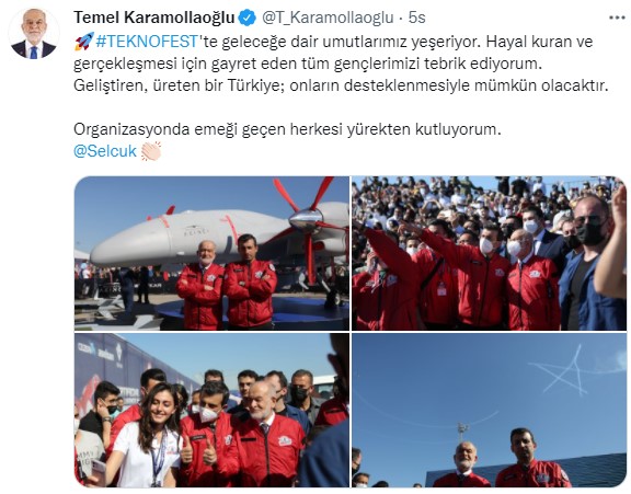 Saadet Partisi Genel Başkanı (SP) Temel Karamollaoğlu, TEKNOFEST ziyaretine ilişkin Twitter hesabından yaptığı paylaşımda, "TEKNOFEST'te geleceğe dair umutlarımız yeşeriyor. Hayal kuran ve gerçekleşmesi için gayret eden tüm gençlerimizi tebrik ediyorum. Geliştiren, üreten bir Türkiye; onların desteklenmesiyle mümkün olacaktır. Organizasyonda emeği geçen herkesi yürekten kutluyorum." ifadelerini kullandı.