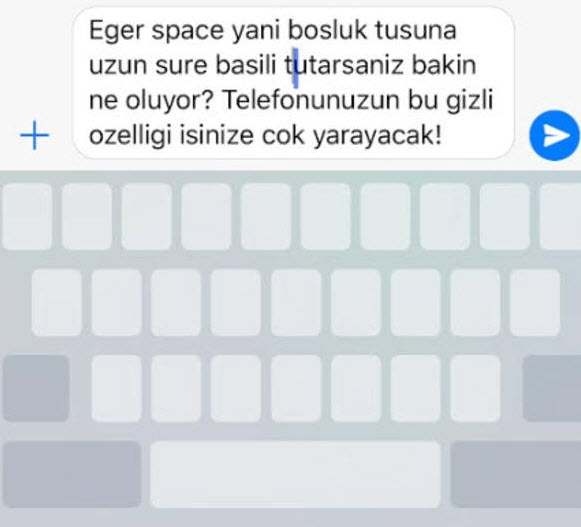 Önce Whatsapp veya iMessage'ı açın; ardından yazdığınız ama henüz göndermediğiniz metin ekrandayken Space tuşuna dokunun.