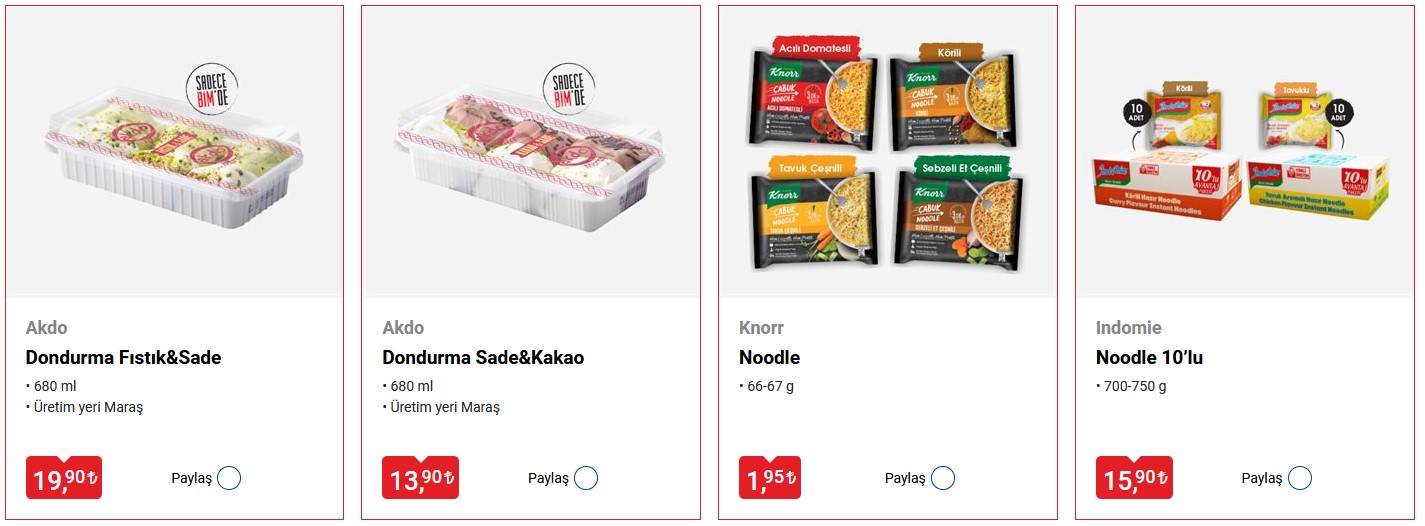 BİM salı kampanyaları başladı. Mayıs ayının ikinci kampanyalarıyla müşterilerinin karşısına çıkan BİM marketler haftanın kataloğunda sürpriz ürünlere yer verdi. 11 Mayıs 2021 BİM aktüel ürünler kataloğunu incelediğimizde temizlik ve şarküteri ürünlerinin yer aldığını görüyoruz. Noodle, dondurma, dondurulmuş fıstıklı soğuk baklava, dondurulmuş pizza tost, siyah zeytin, labne, buğday unu, peynir çeşitleri gibi çeşit çeşit ürünler bu katalogda yer alıyor... BİM salı indirimleri neler? 11 Mayıs BİM aktüel ürünler kataloğunda hangi ürünler var? İşte merakla araştırılan BİM salı indirimleri...