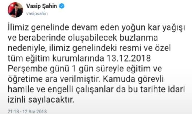 Ankara Valiliği sosyal medya üzerinden yayılan Ankara Valisi Vasip Şahin'in "okullar tatil ilan edildi" açıklamasının sahte olduğunu vurguladı.