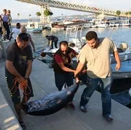 İzmir'in Aliağa ilçesi açıklarında tekneyle balık avlamaya çıkan Aliağalı amatör balıkçılar Mustafa Sağlamtürk ve Kemal Mete, 1 buçuk metre boyunda 75 kilo ağırlığında orkinos yakaladı