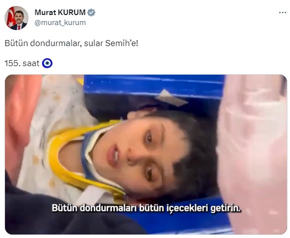 Mucize kurtuluş bu kez kendisini Gaziantep'in Nurdağı ilçesinde gösterdi. Deprem bölgesinde enkaz altından 155 saat sonra 8 yaşındaki Semih Ege İnce sağ çıkarıldı. Kurtarma anında büyük coşku yaşayan ekipler, Semih Ege İnce'ye ne istediğini sordu. Semih'in yanıtı ise "Bana damacana su ve dondurma verin" şeklinde oldu. Diğer yandan Semih, Süper Lig'de taraftarı olduğu takımı ve en sevdiği futbolcuları açıkladı. Tarihe geçen anlara dair Çevre Şehircilik ve İklim Değişikliği Bakanı Murat Kurum da dikkat çeken bir mesaj verdi.