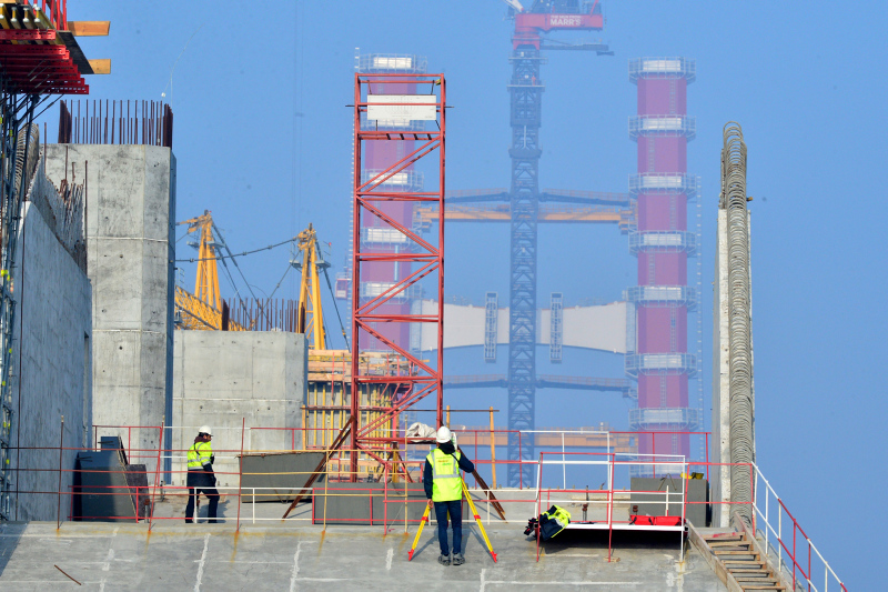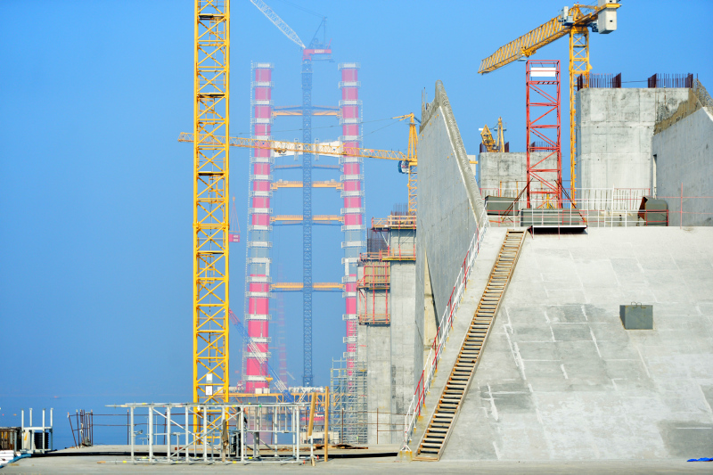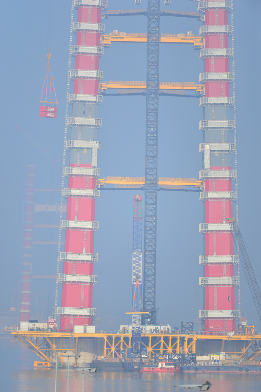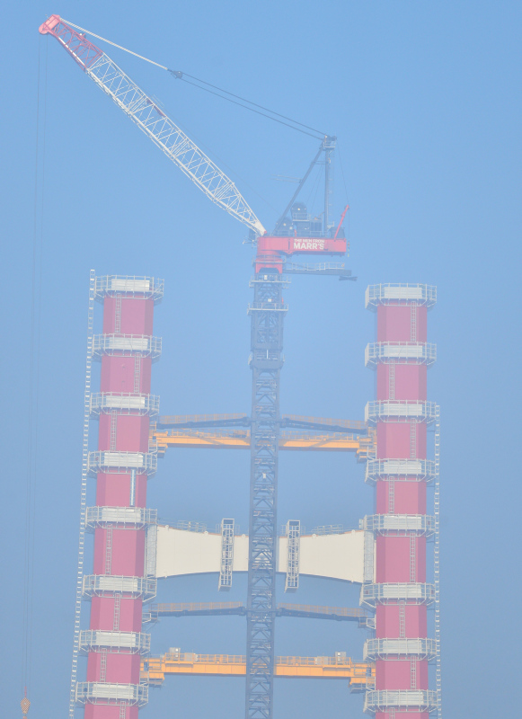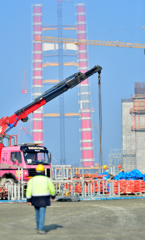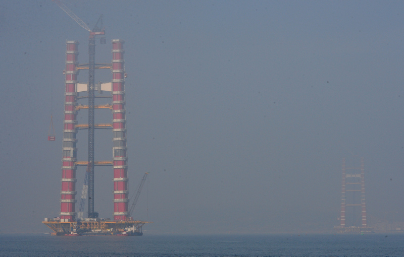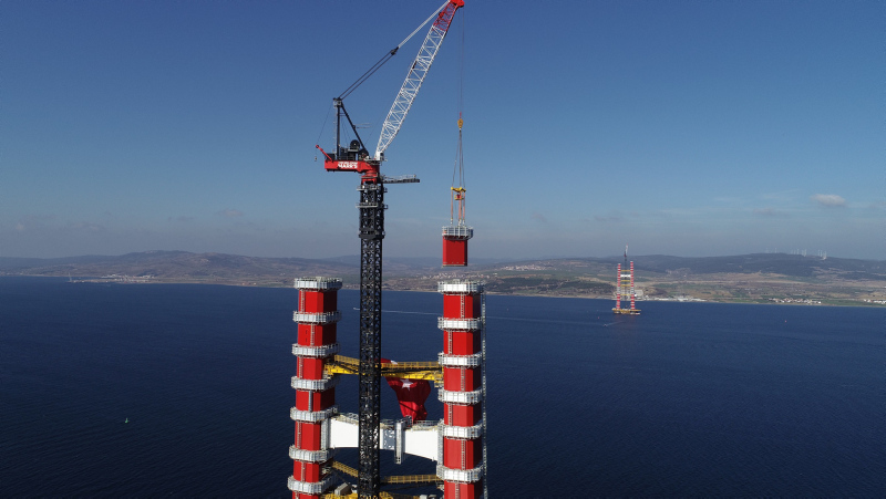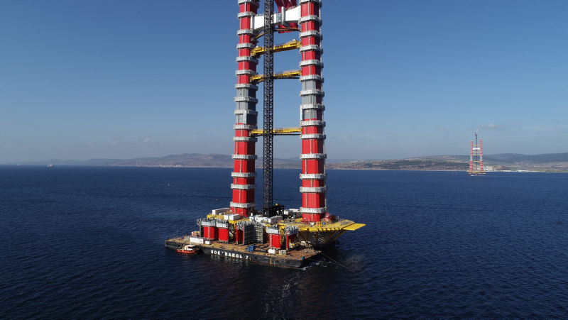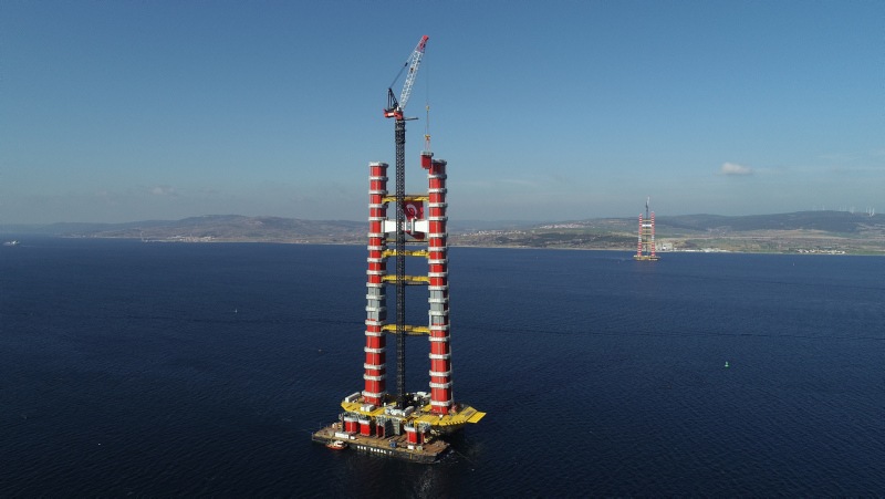 Köprünün Türk Bayrağının renklerini temsilen kırmızı beyaz ayaklarının inşasının yüzde 56,3'ü tamamlanmış son durumu havadan görüntülendi. Sütlüce ve Şekerkaya şantiyelerinde, köprü ayaklarına vinç yardımıyla getirilen kule blokları üst üste konulmaya devam ediyor.