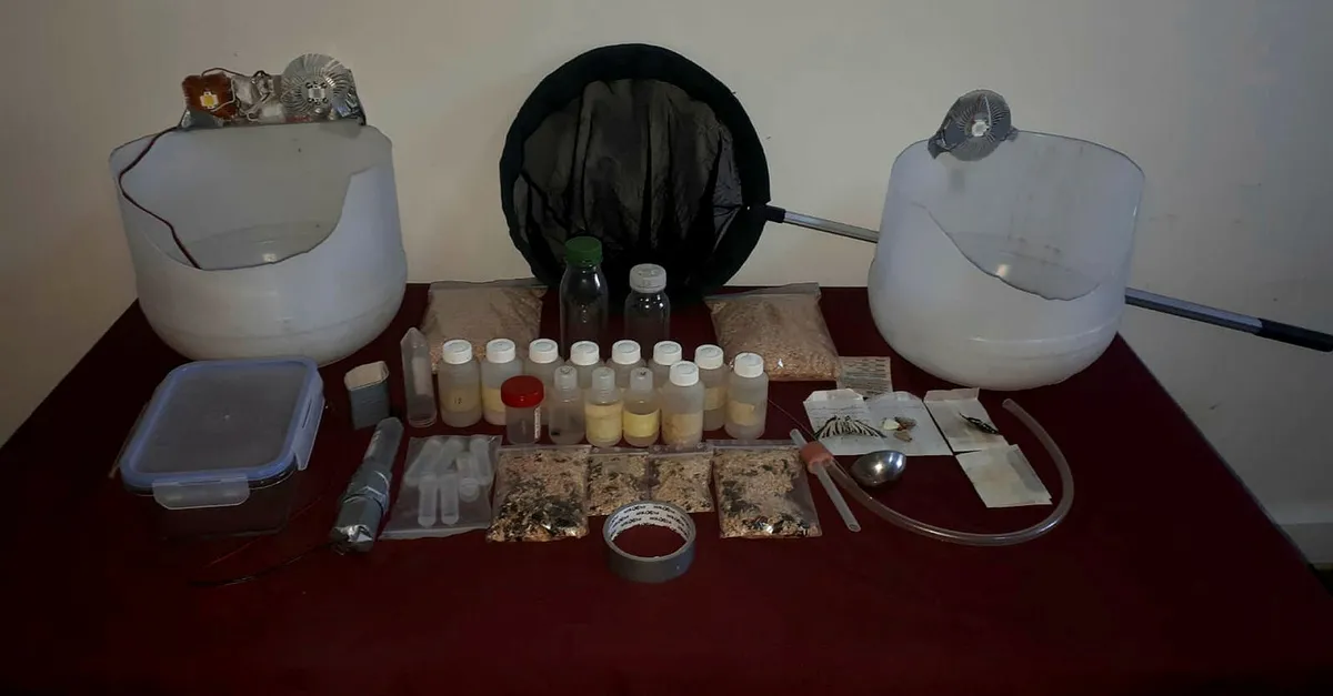 Profesör oldukları belirlenen şüphelilerin kaldıkları odada ve araçlarında yapılan aramalarda 2'si ışıklı 4 böcek yakalama tuzağı, 11 böcek muhafaza kutusu, 3 alkol kutusu ile yaklaşık 600 böcek ve 25 kelebek bulundu.