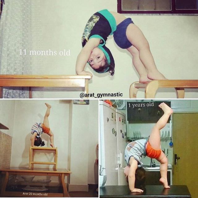 İranlı Arat Hosseini, bebeğin yaptıklarını görenler gözlerine inanamıyor. Henüz 9 aylıkken babasının jimnastik eğitimi vermeye başladığı Arat bebek şuan sadece 2 yaşında ve yapabildikleri çoğu yetişkin için bile imkansız.