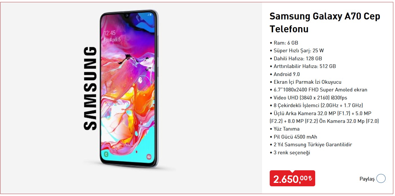 • Üçlü Arka Kamera 32.0 MP (F1.7) + 5.0 MP (F2.2) + 8.0 MP (F2.2) Ön Kamera 32.0 Mp (F2.0)