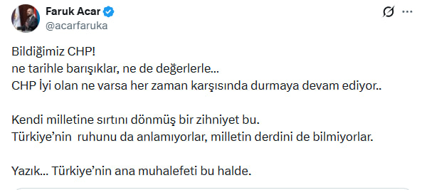 AK Parti Genel Başkan Yardımcısı, Tanıtım ve Medya Başkanı Faruk Acar, CHP'nin tavrına tepki göstererek, "Bildiğimiz CHP!