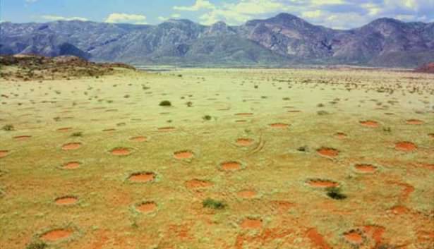 PERİ HALKALARI-NAMİBYA Bir çimen çemberi tarafından çevrelenmiş kara parçasıdır. Bilim insanları bu muhteşem doğa olayını akkarıncaların oluşturduğunu tahmin ediyor.