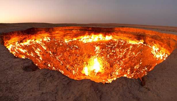 CEHENNEME AÇILAN KAPI-TÜRKMENİSTAN Türkmenistan'ın Derveze bölgesindeki bu kuyu tam 43 yıldır aralıksız yanıyor. Sovyet döneminde bilim insanları, burada biriken doğalgazı yok etmek için ateşe verdi. Bilim insanlarının 1971'de yaktığı ateş hala söndürülemiyor. Yöre halkı burayı "Cehenneme açılan kapı" olarak adlandırıyor.
