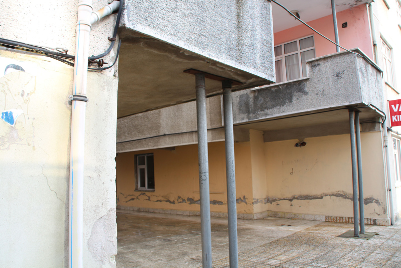 Gün geçtikçe binalardaki eğim artarken, 24 daireli bina ile bitişiğindeki bina arasında boşluk oluştu. Yüzde 6 dolayında eğim olduğu belirlenen yapılar, sahipleri tarafından demir direklerle güçlendirilmeye çalışıldı.