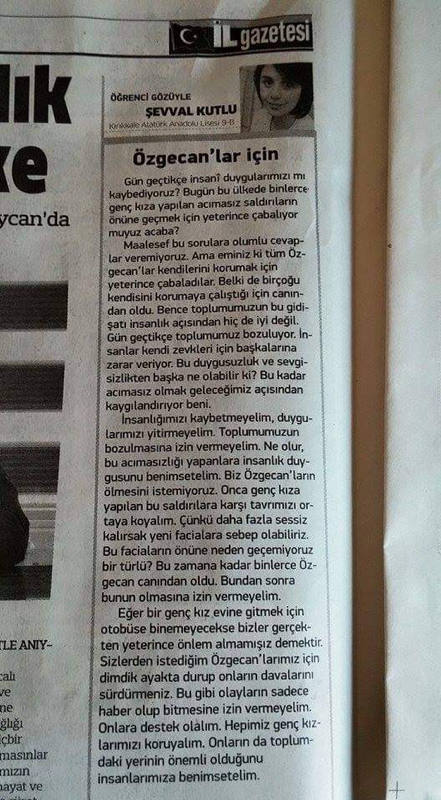 Şevval Abanoz'un, 2015 yılında 9'uncu sınıf öğrencisiyken Kırıkkale'deki yerel gazetede, 11 Şubat 2015'te Mersin'in Tarsus ilçesinde tecavüz girişimine direndiği için minibüste öldürülen üniversite öğrencisi Özgecan Aslan için köşe yazısı yazdığı ortaya çıktı. Şevval Abanoz'un, annesi Gamze Kutlu'nun 7 yıldır sakladığı gazetede, 'Özgecan'lar için' başlığıyla "Biz Özgecan'ların ölmesini istemiyoruz. Onca genç kıza yapılan bu saldırılara karşı tavrımızı ortaya koyalım. Çünkü daha fazla sessiz kalırsak yeni facialara sebep olabiliriz. Bu faciaların önüne neden geçemiyoruz bir türlü? Bu zamana kadar binlerce Özgecan canından oldu. Bundan sonra bunun olmasına izin vermeyelim. Eğer bir genç kız evine gitmek için otobüse binemeyecekse bizler gerçekten yeterince önlem almamışız demektir" yazdığı ortaya çıktı.