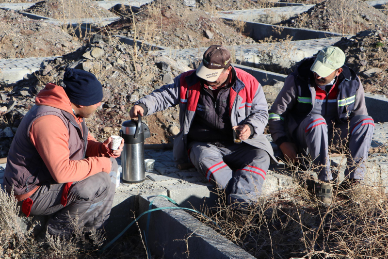 Saat 07.30'da mesaiye başlayan işçiler, 16.30'a kadar mezar açma işlemlerini yapıyor. İşçiler zaman zaman mola verip yanlarında getirdikleri termosdaki çaylarını yudumlayarak yorgunlularını gideriyor.
