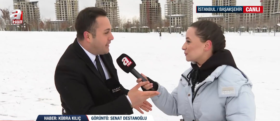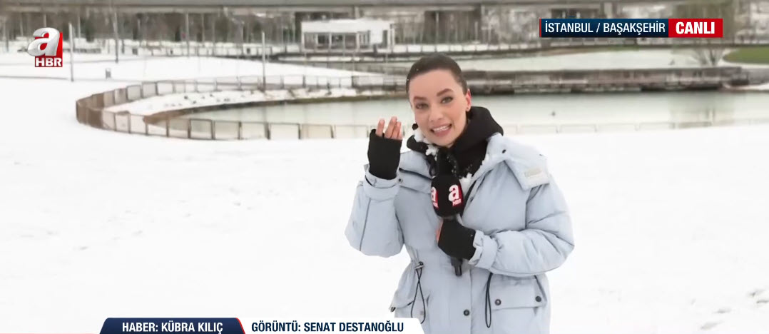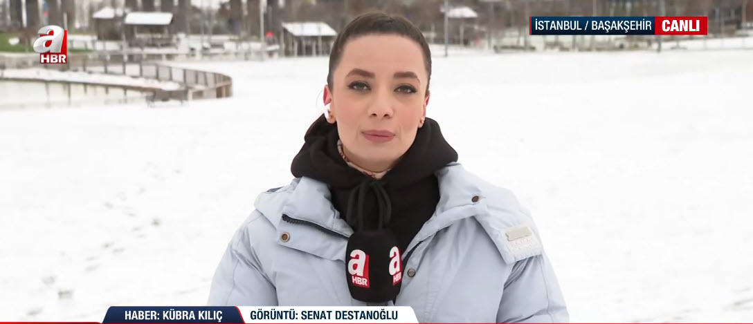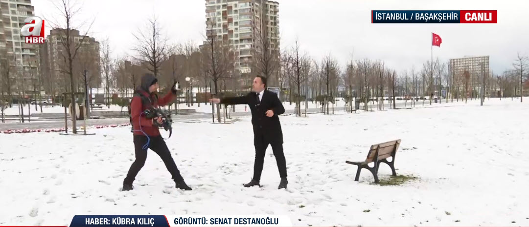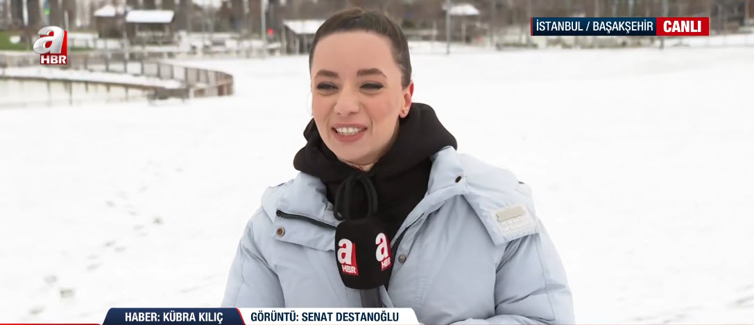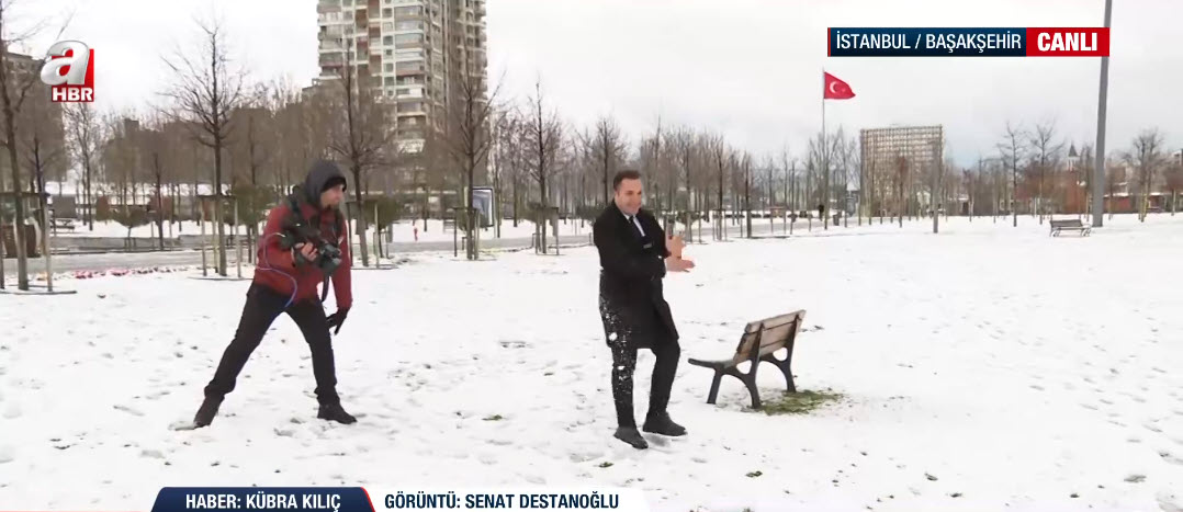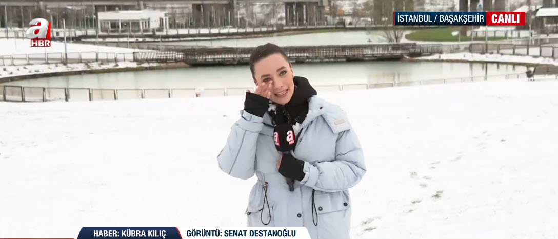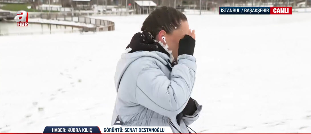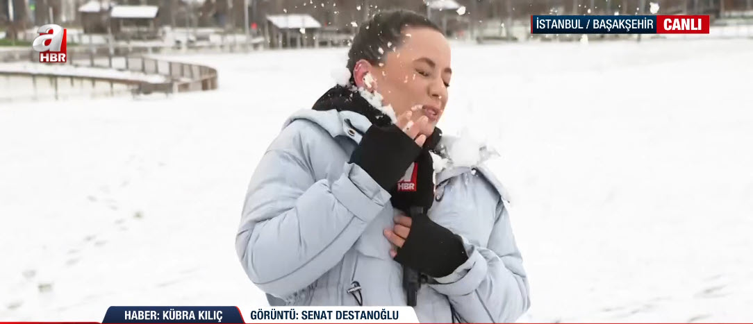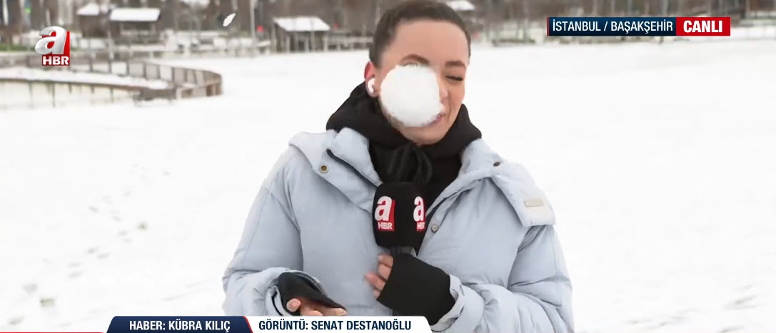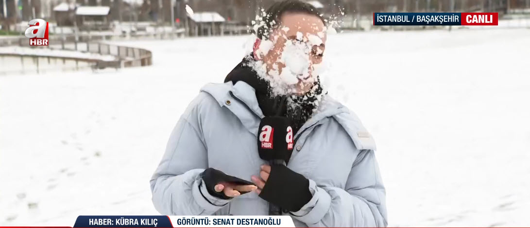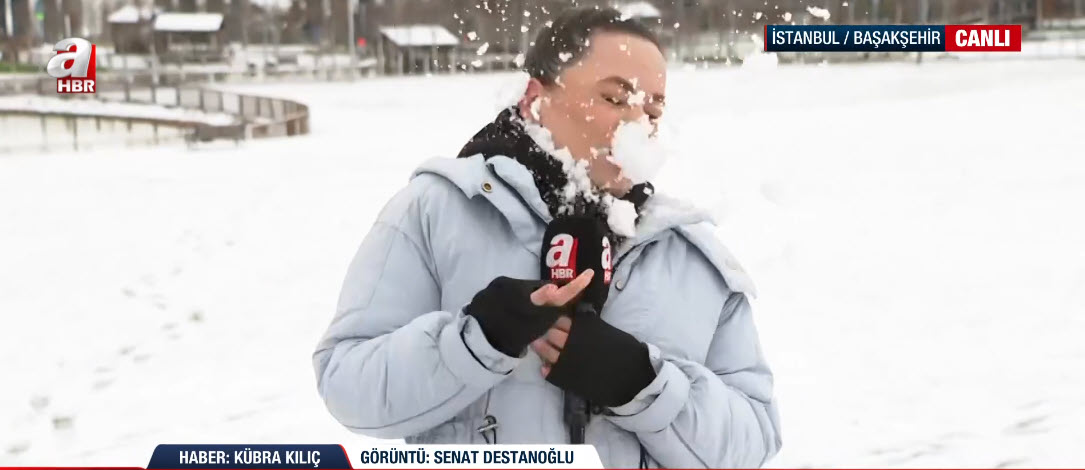 İstanbul'da soğuk havanın etkisi sürüyor. A Haber ekipleri haber nöbetini sürdürüyor. A Haber ekibinden Kübra Kılıç, canlı yayınında Başakşehir'deki son durumu aktarırken suratına gelen kar topuyla neye uğradığını şaşırdı. İşte o renkli anlar...
