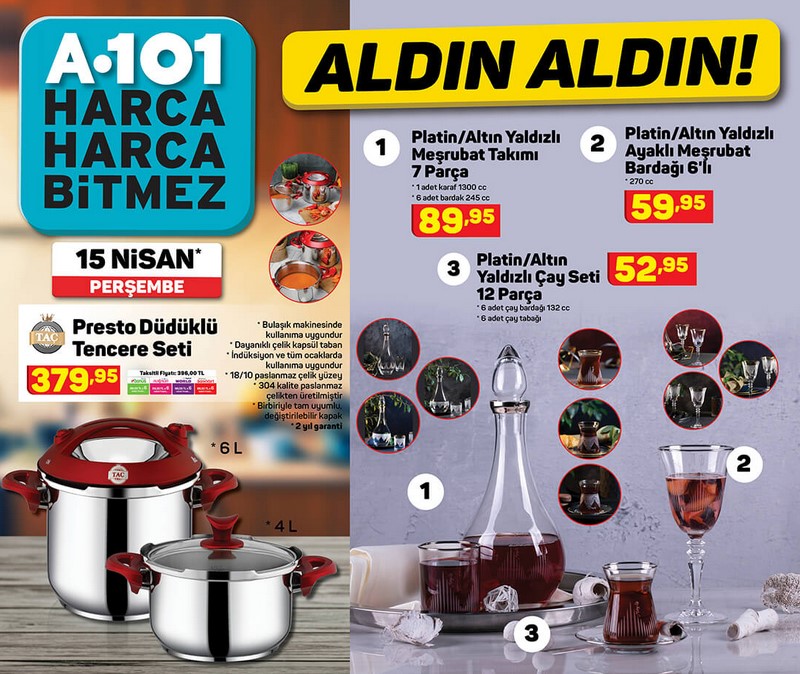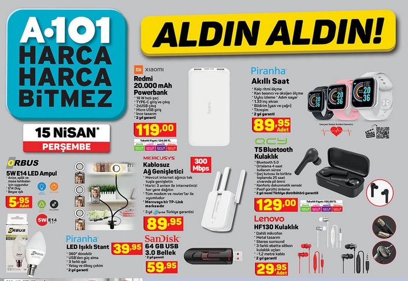 A101 perşembe indirimleri neler? 15 Nisan 2021 tarihli A101 kampanyalarını merak eden vatandaşlar, internet üzerinden güncel kampanyaları araştırıyor. Haftanı kataloğunda iki adet televizyon ile bir tablet ve bir cep telefonu ilk sayfada gösterildi. Sayfanın devamında ise elektronik ev aletlerinin yanı sıra züccaciye, tekstil, gıda ve temizlik ürünleri de ön plana çıkıyor. İşte A101'de bu hafta neler var? İşte kampanyalı ürünler...