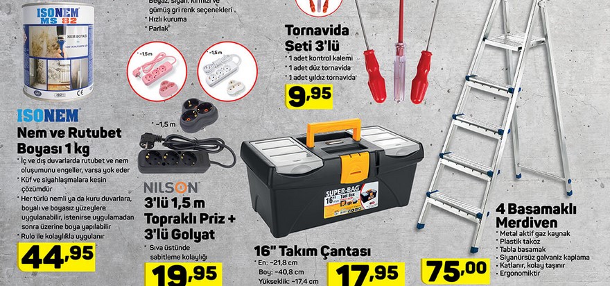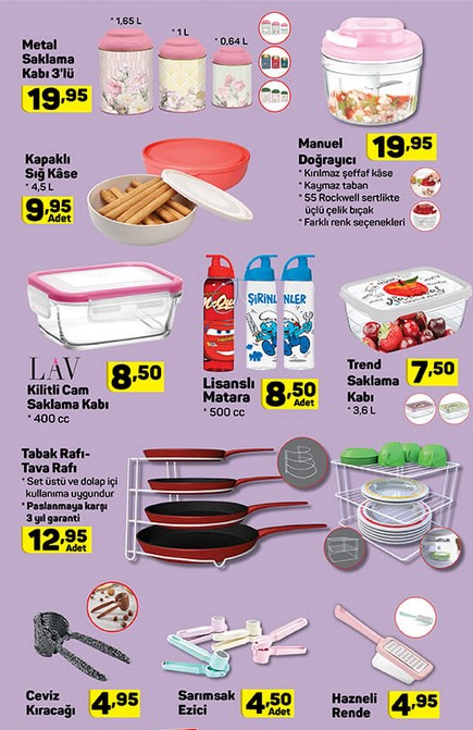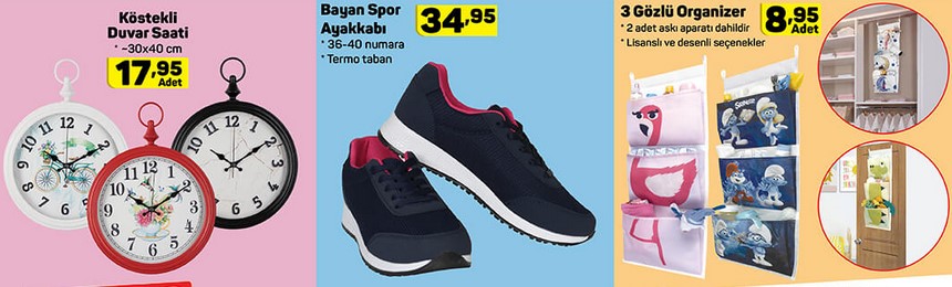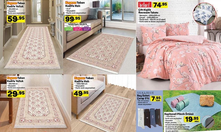 Silk&Blue Bay Soket Çorap 7,95 TL. Kapitoneli Piknik Örtüsü 19,95 TL. Kaymaz tabanlı Kadife Halı 49,95 TL. Kaymaz tabanlı Kadife Yolluk 29,95 TL. Özel üretim askı aparatı ile satışa sunulan Askılı Vakum Poşet 9,95 TL. 3 Gözlü Organizer 8,95 TL. Bayan Spor Ayakkabı 34,95 TL. Köstekli Duvar Saati 17,95 TL. 5 Raflı Kitaplık 99,95 TL. 4 Raflı Çok Amaçlı Dolap 179 TL. Porland Tekli Porselen Ürünler 5,95 TL. Lav Kilitli Cam Saklama Kabı 8,50 TL.