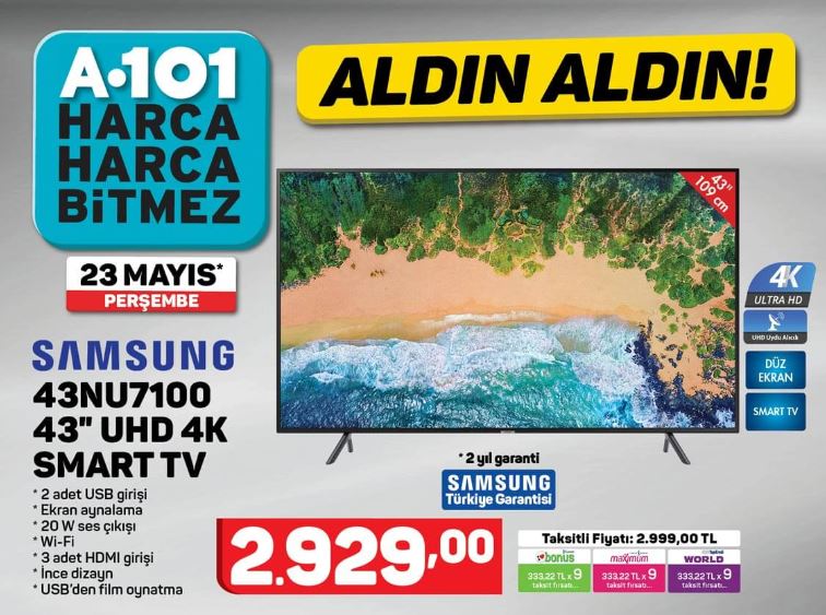 A101 aktüel ürünler kataloğu 23 Mayıs ile raflarda yer alacak olan Samsung Led TV üstün özellikleri ve cazip fiyatı ile dikkat çekiyor. Samsung Led TV için kredi kartına 9 taksit imkanı da sunuluyor. Ayrıca Samsung Led TV, Samsung Türkiye garantisi kapsamında. İşte A101 aktüel ürünler kataloğu 23 Mayıs ile tanıtılan Samsung Led TV'nin özellikleri...