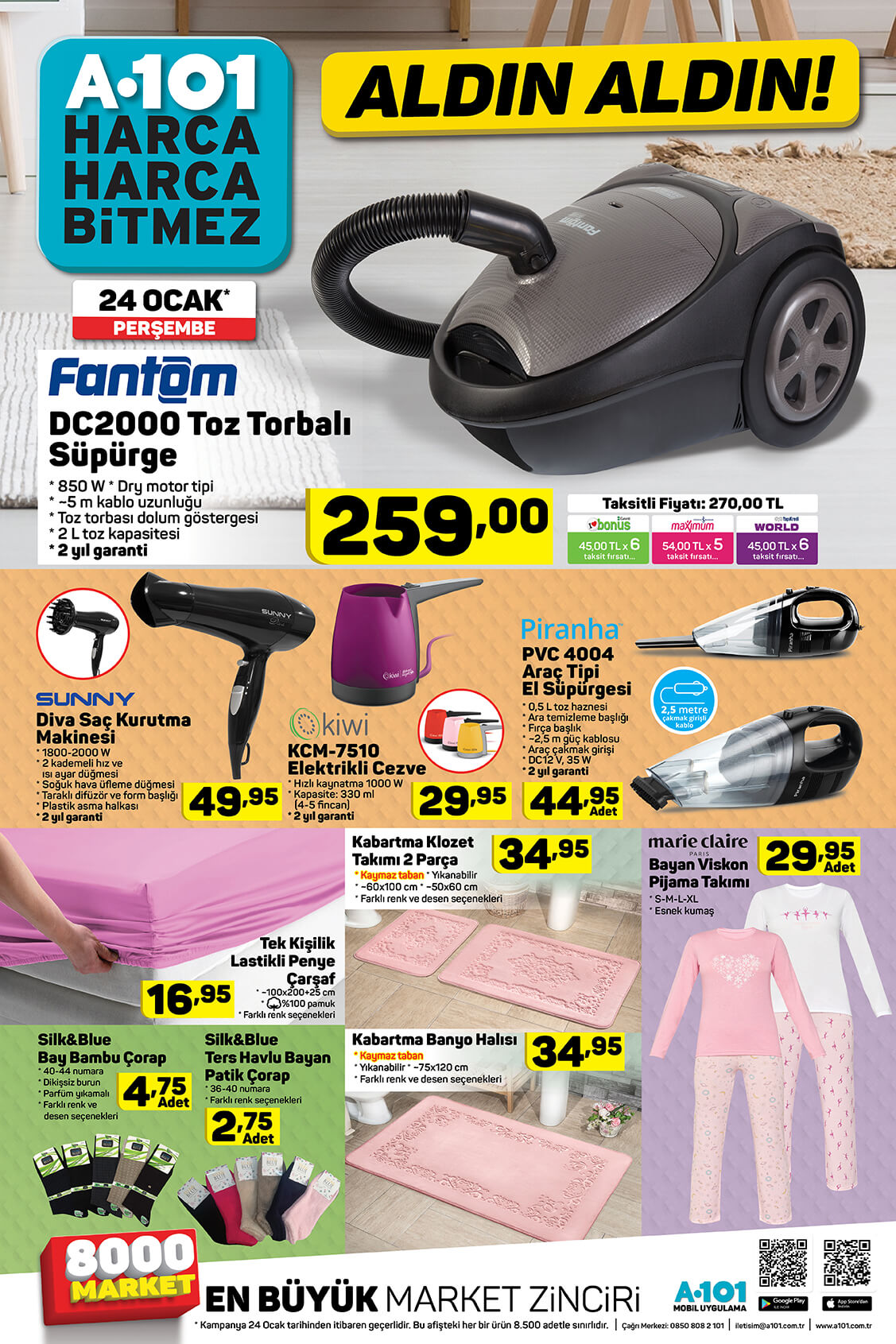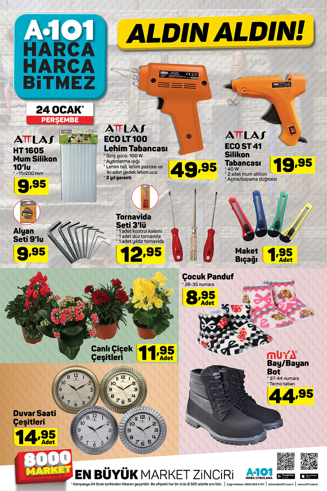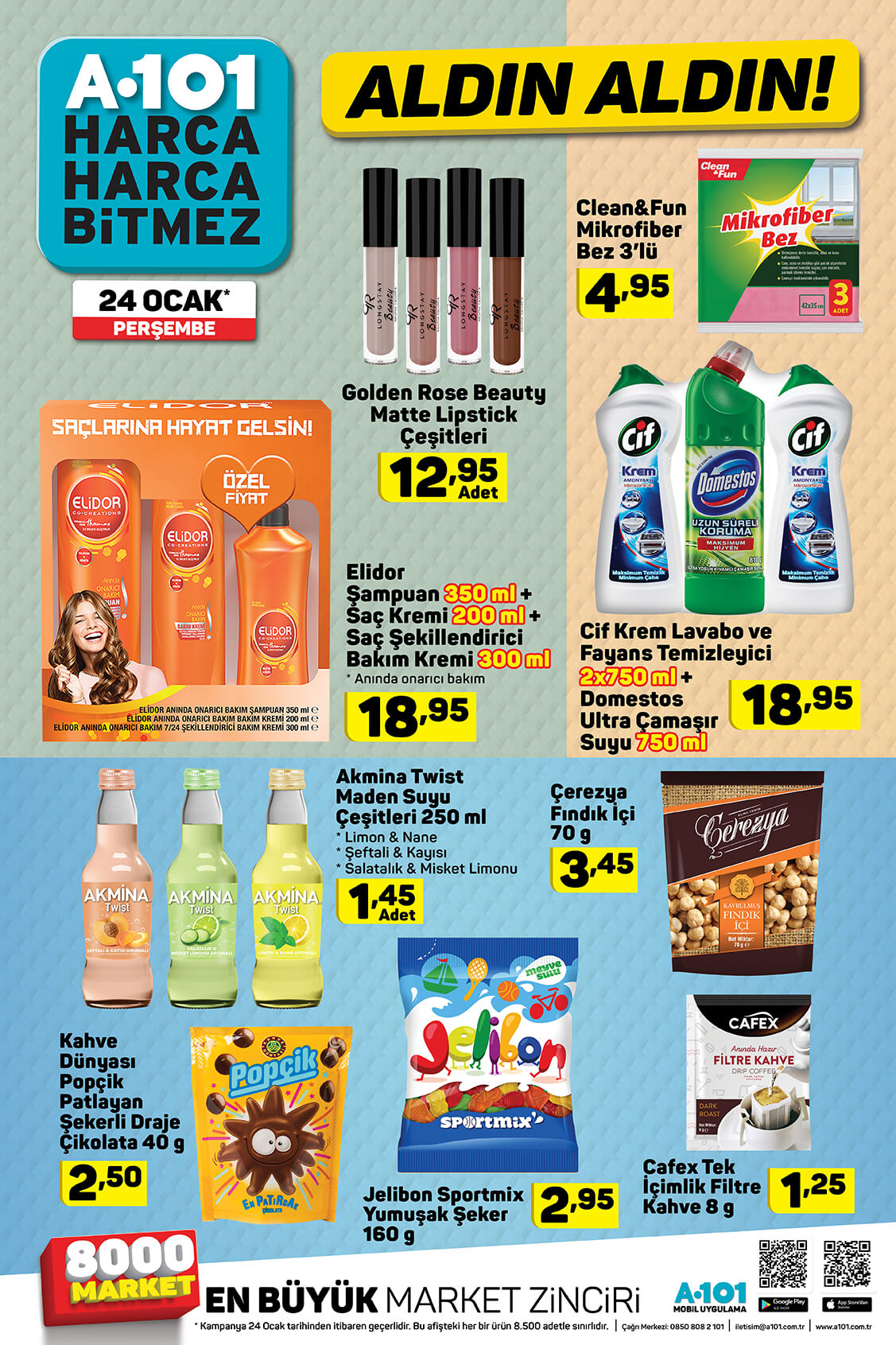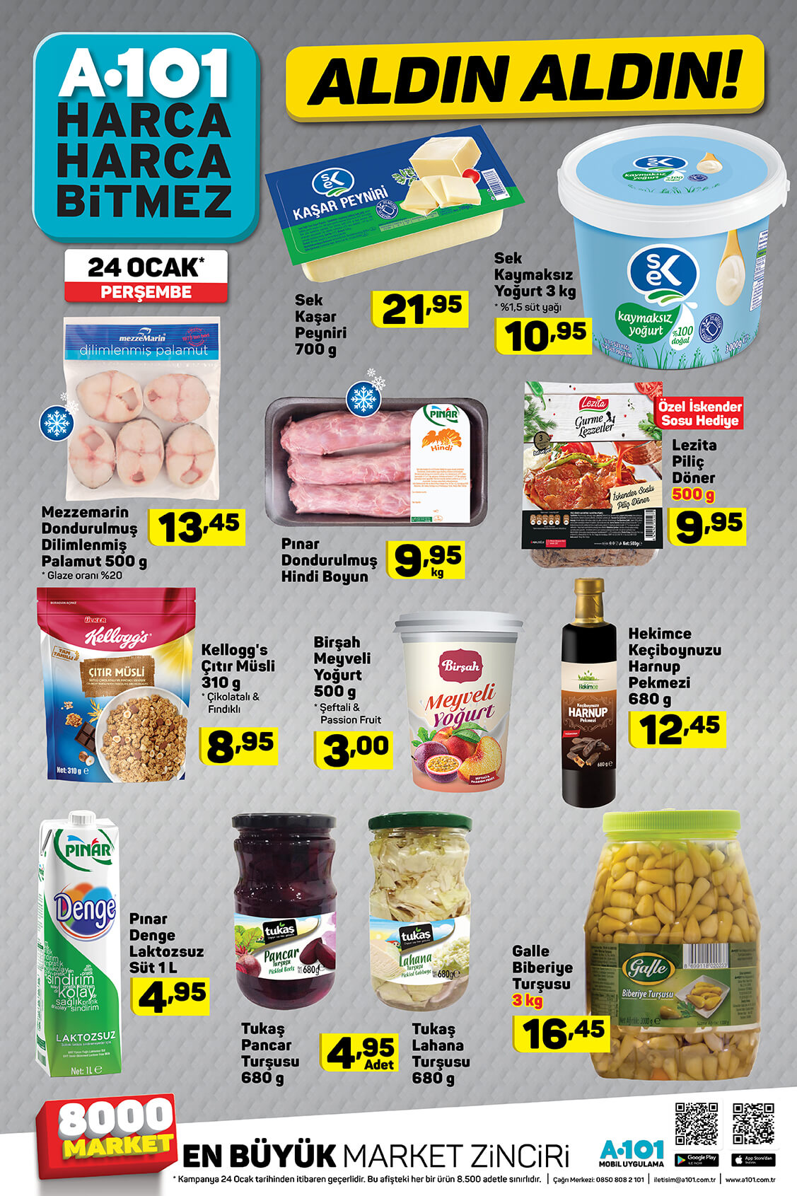 A101 24 Ocak kataloğu yayınlandı. A101 indirimli ürünler kataloğu teknoloji ürünleri ile ön plana çıktı. Elton marka LED TV, Honor 9 Lite akıllı telefon, Lenova Tab7 tablet, A101 kataloğunda en çok ilgi gören ürünler. Vatandaşlar teknoloji ürünlerinin yanı sıra yiyecek, içecek çeşitlerindeki indirimleri de merak ediyor. A101 gıda ve detarjan indirimlerini de A101 19-25 Ocak aldın aldın kataloğu ile yayınladı. İşte A101 indirimli ürünler kataloğu ve fiyatları