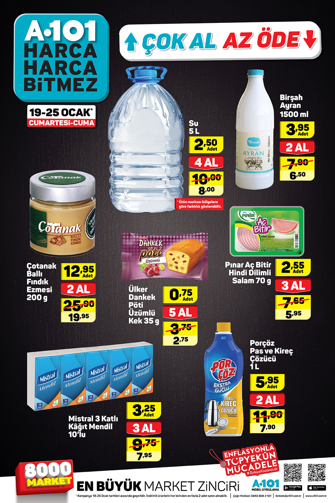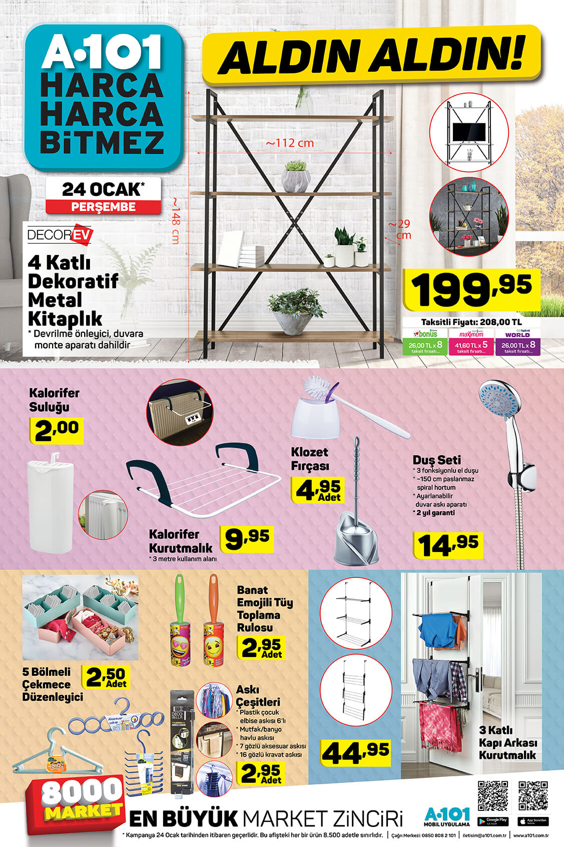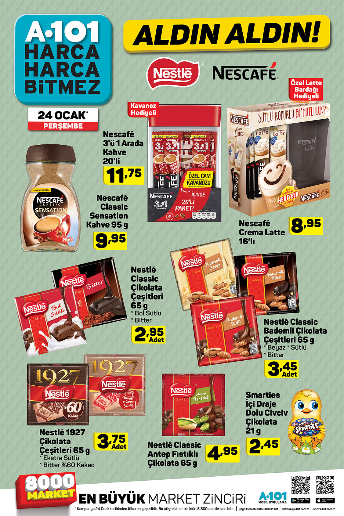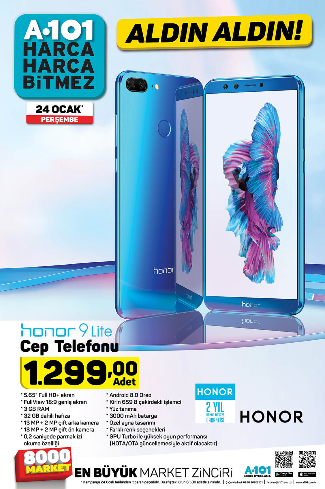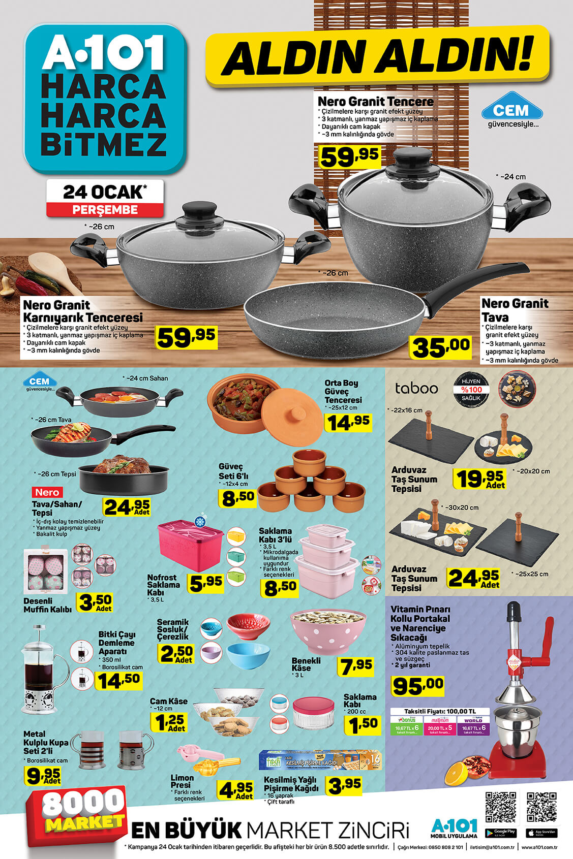 A101 24 Ocak kataloğu yayınlandı. A101 indirimli ürünler kataloğu teknoloji ürünleri ile ön plana çıktı. Elton marka LED TV, Honor 9 Lite akıllı telefon, Lenova Tab7 tablet, A101 kataloğunda en çok ilgi gören ürünler. Vatandaşlar teknoloji ürünlerinin yanı sıra yiyecek, içecek çeşitlerindeki indirimleri de merak ediyor. A101 gıda ve detarjan indirimlerini de A101 19-25 Ocak aldın aldın kataloğu ile yayınladı. İşte A101 indirimli ürünler kataloğu ve fiyatları