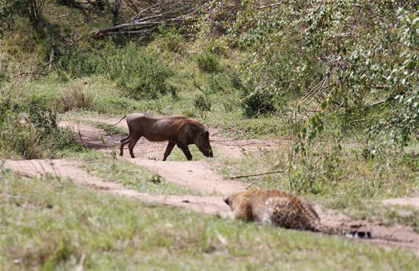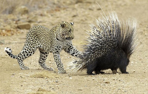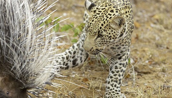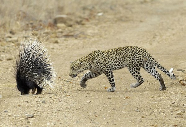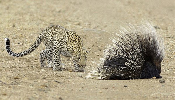 Peşinde koştuğu kirpi kendini savunmaya geçince ona yaklaşamayan leopar uzun çabalar sonuç vermeyince çareyi pes etmekte buldu.