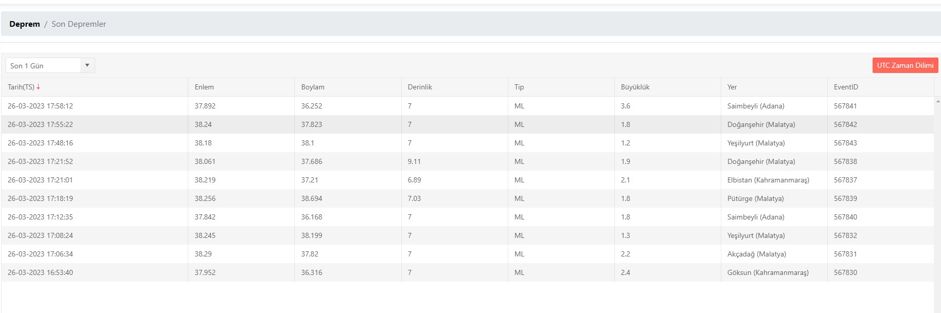 26-03-2023 17:48:16 38.18 38.1 7 ML 1.2 Yeşilyurt (Malatya) 567843
