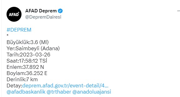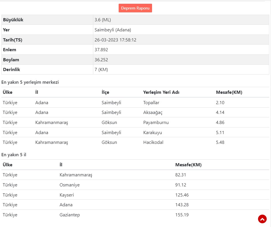 26-03-2023 17:58:12 37.892 36.252 7 ML 3.6 Saimbeyli (Adana) 567841