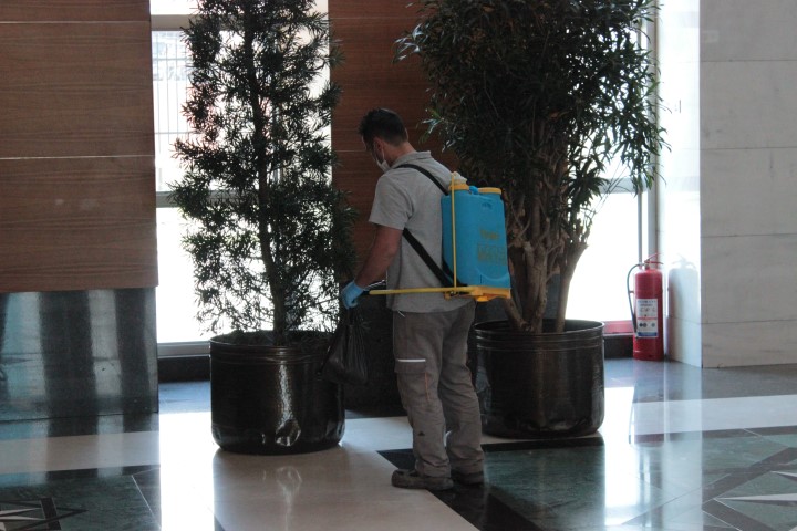 Bu kapsamda görevliler, giriş katından itibaren binada ilaçlama yaptı.