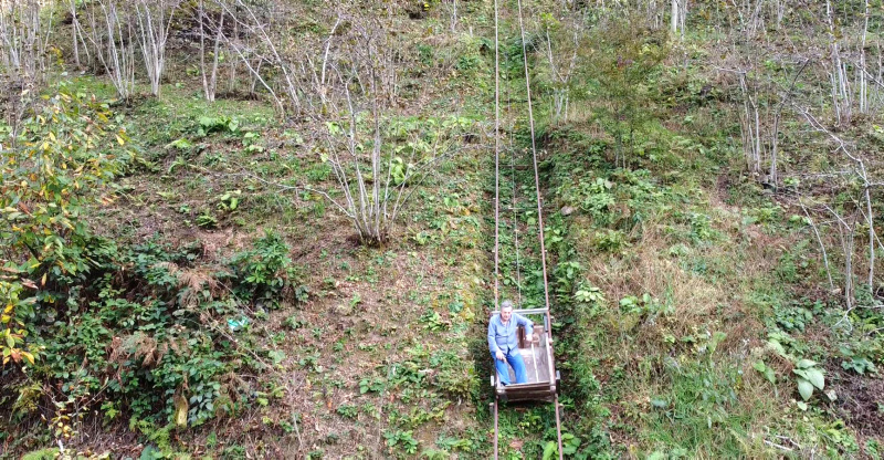 Uzaktan kumandalı elektrikli vagona binen Kadıoğlu, yaklaşık 80 derece eğimli fındık bahçesinden geçerek 2,5 dakikalık yolculukla tepedeki evine inip çıkıyor. Kadıoğlu, "Görenler çok heyecan verici olduğunu söylüyor" dedi.
