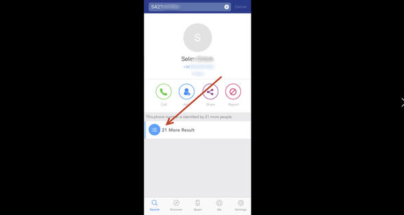 Arama sonuçları işte bu kısımda görünüyor. Girdiğimiz bu numara şu an için 21 farklı rehberde kayıtlı görünüyor (tabii uygulamayı indirenlerin rehberinden bahsediyoruz). Üzerine dokunun.